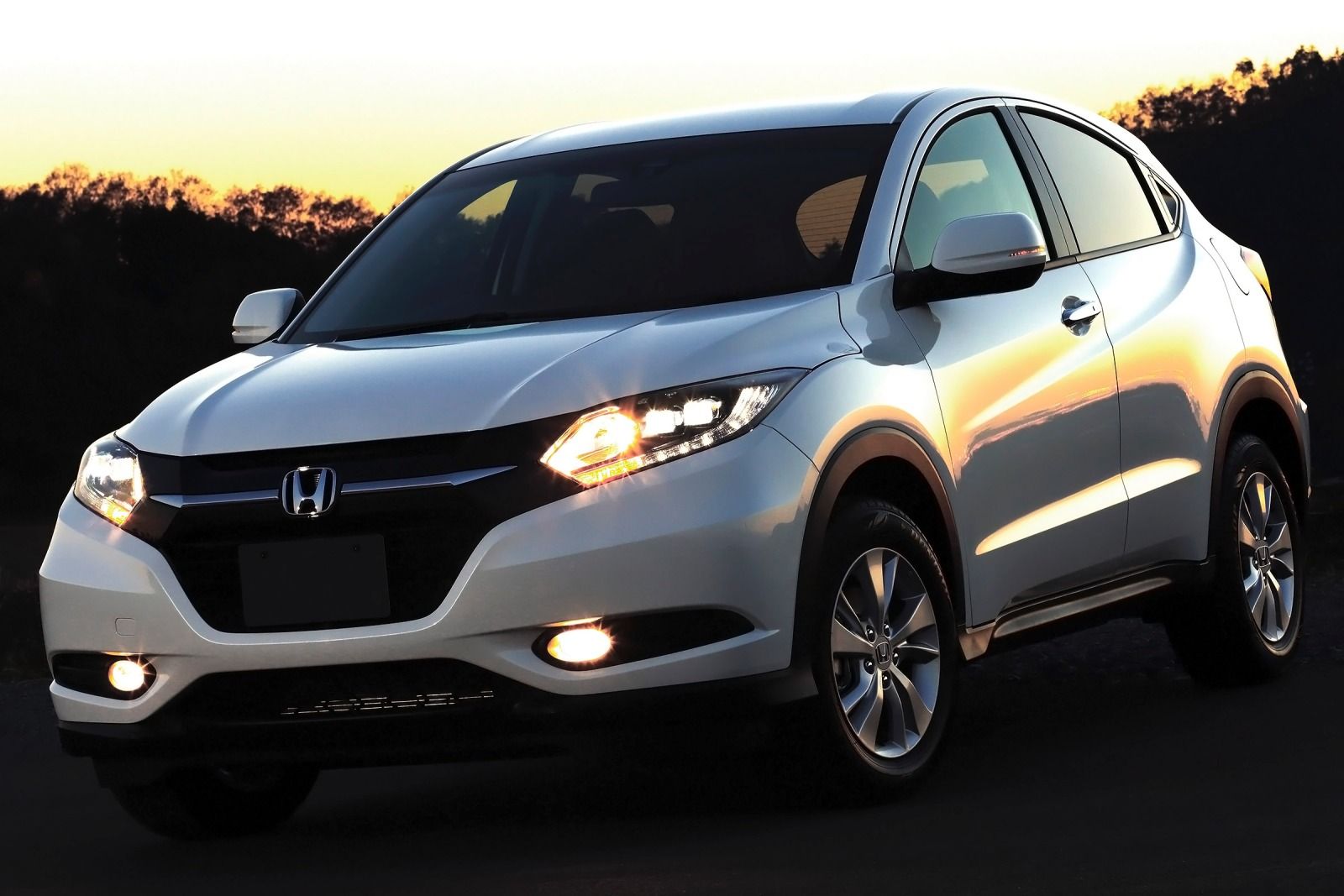 Description: A white honda hr - v is parked in a parking lot at sunset with trees in the background and a sky line.