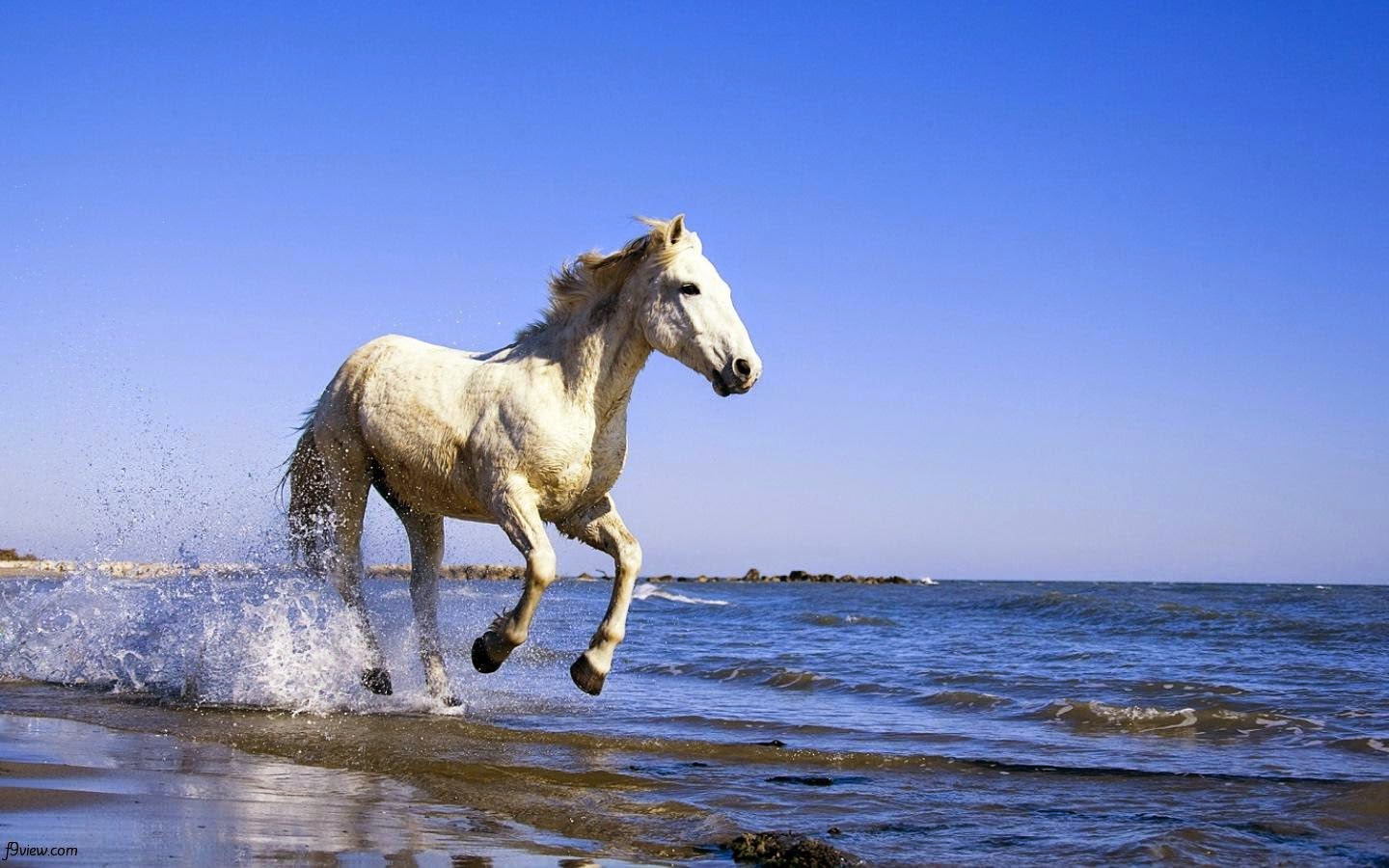 Description: A white horse running through the water on a beach near the ocean with a blue sky in the background.