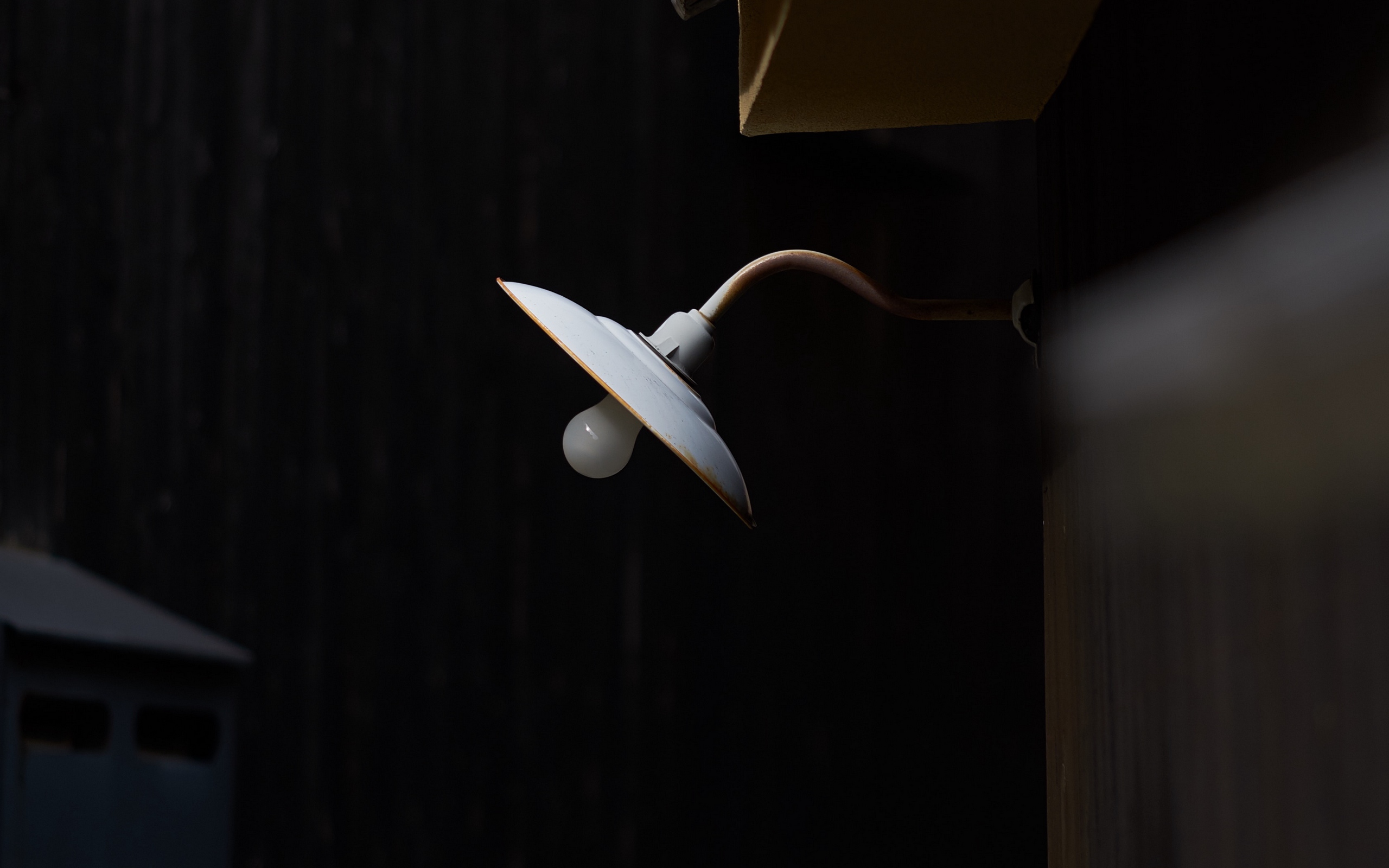 Description: A white light is hanging from a black wall and a black wall is behind it and a white light is hanging from a black wall.