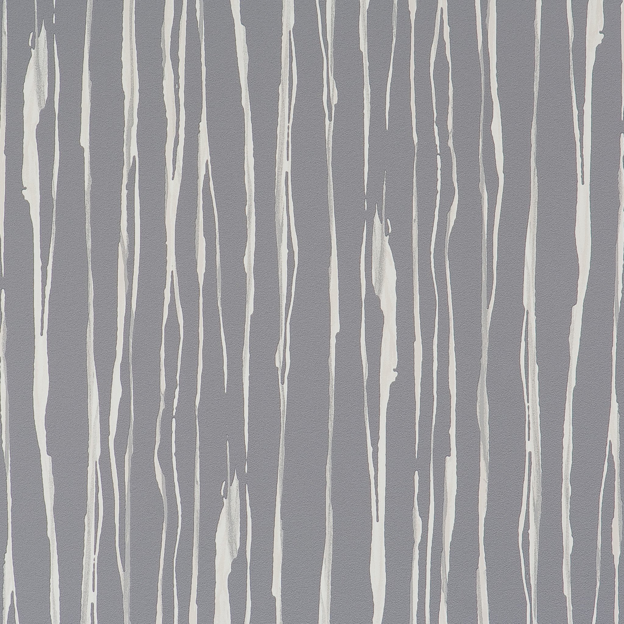 Description: A painting of white lines on a gray background with a white stripe pattern on the wall behind it and a white vase in the foreground.