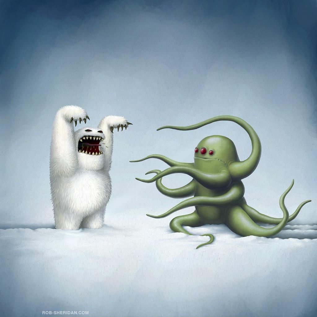 Description: A couple of white monsters standing next to each other on a blue background with a white background and a blue background.