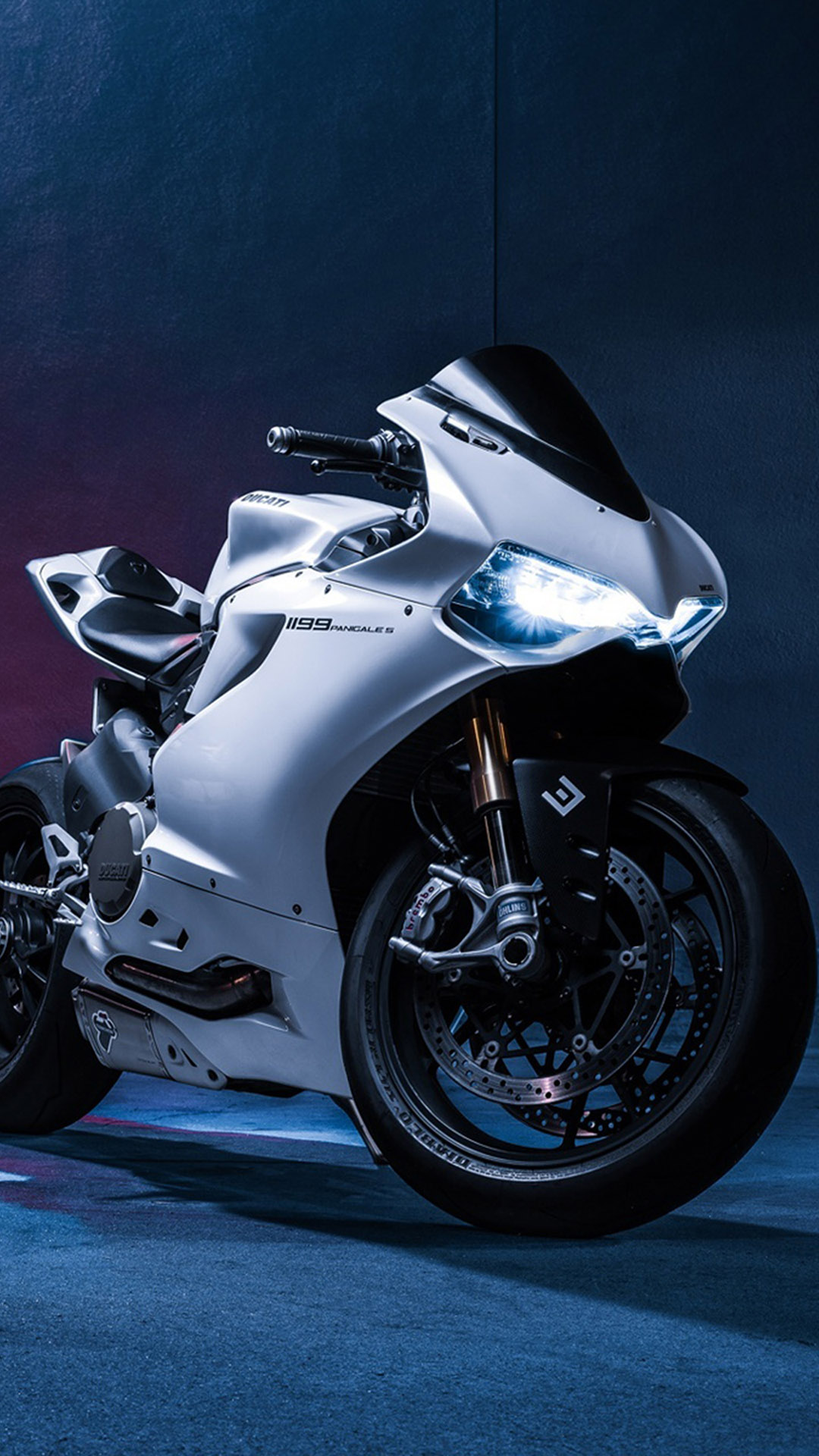 Description: A white motorcycle parked in a dark room with a blue background and a red light behind it and a black light behind it.