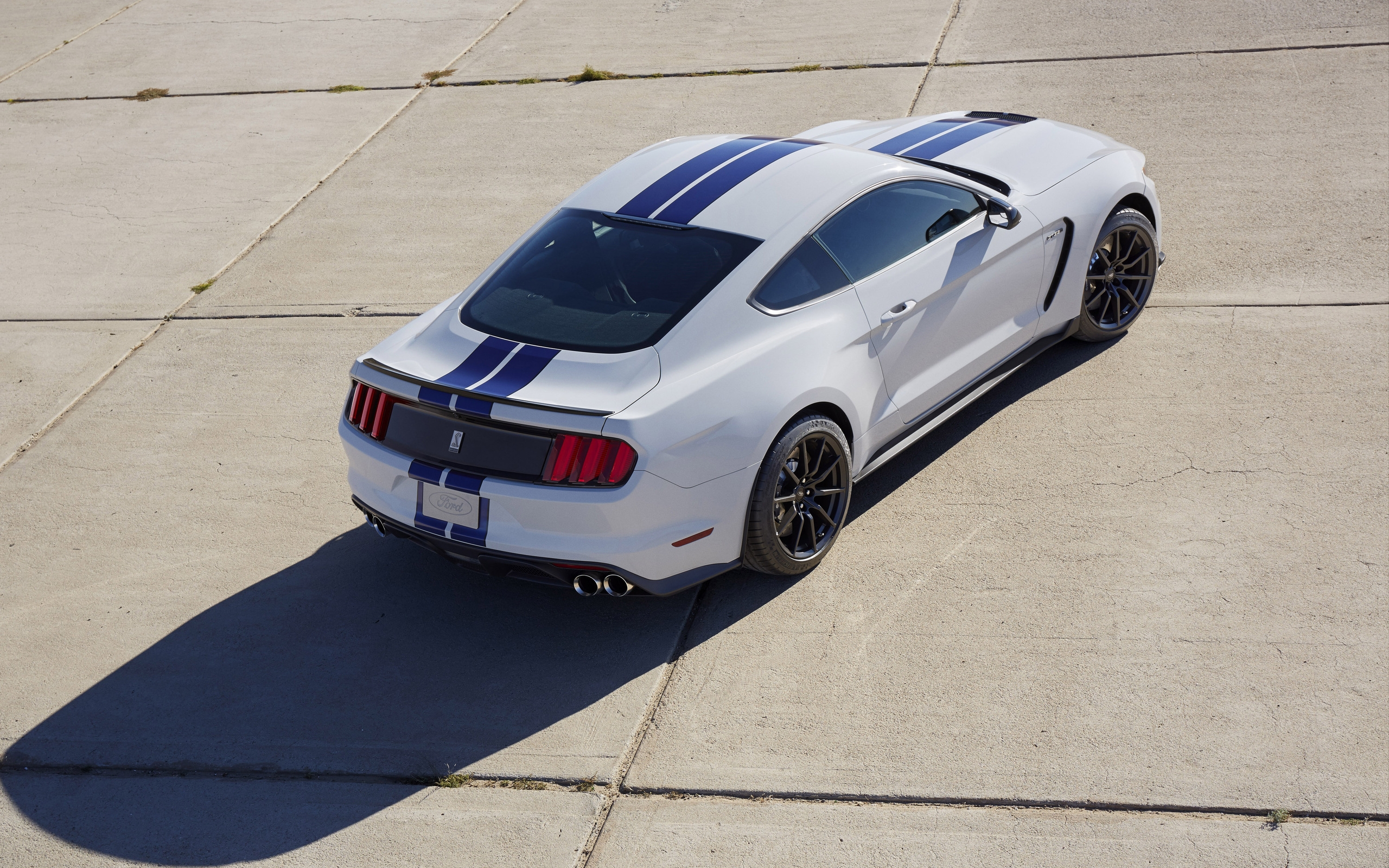 Description: A white mustang with blue stripes parked on a concrete surface with a shadow of a person standing next to it.