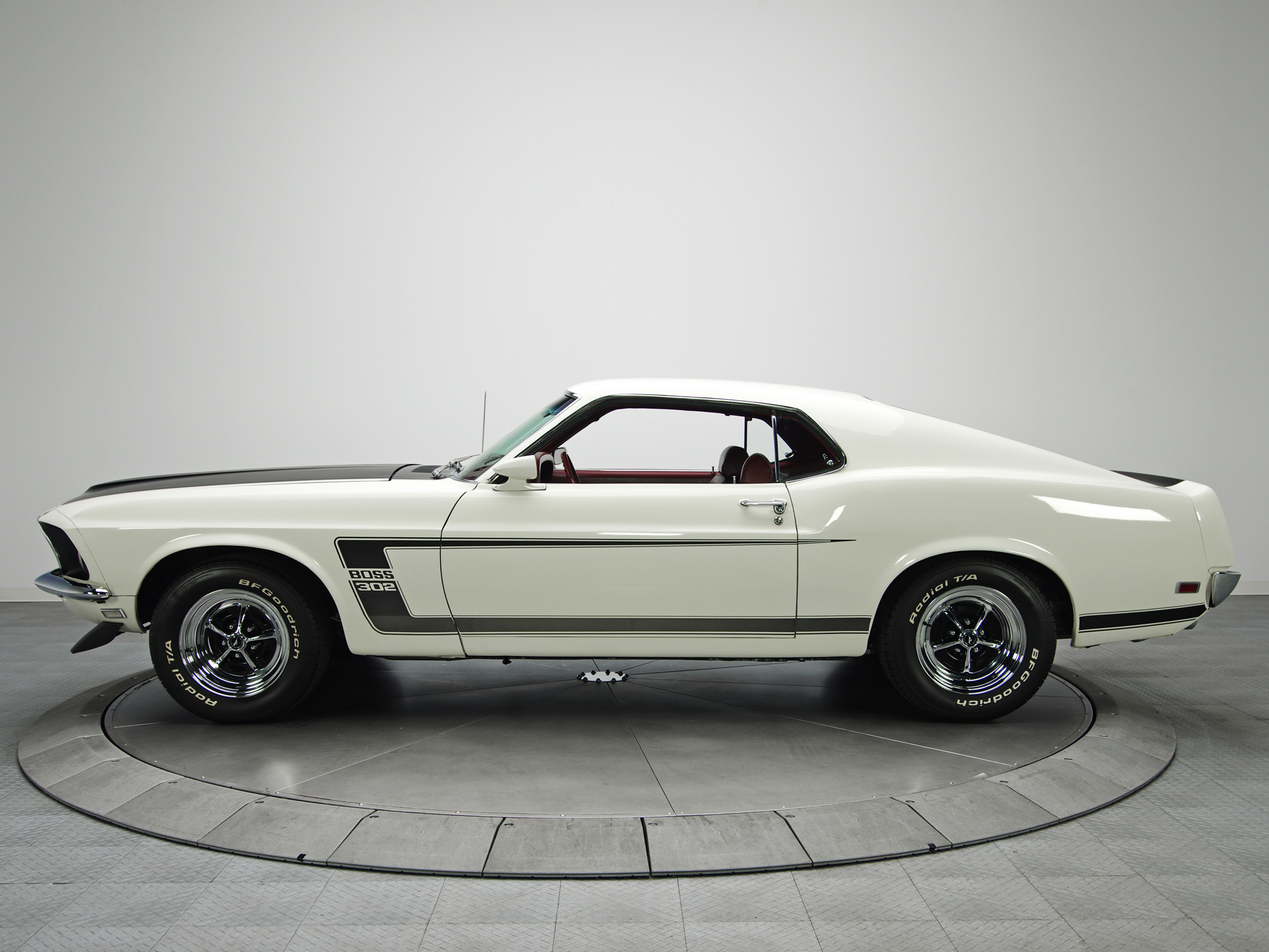 Description: A white mustang mustang car sitting on a round platform in a room with a gray wall and a black and white floor.