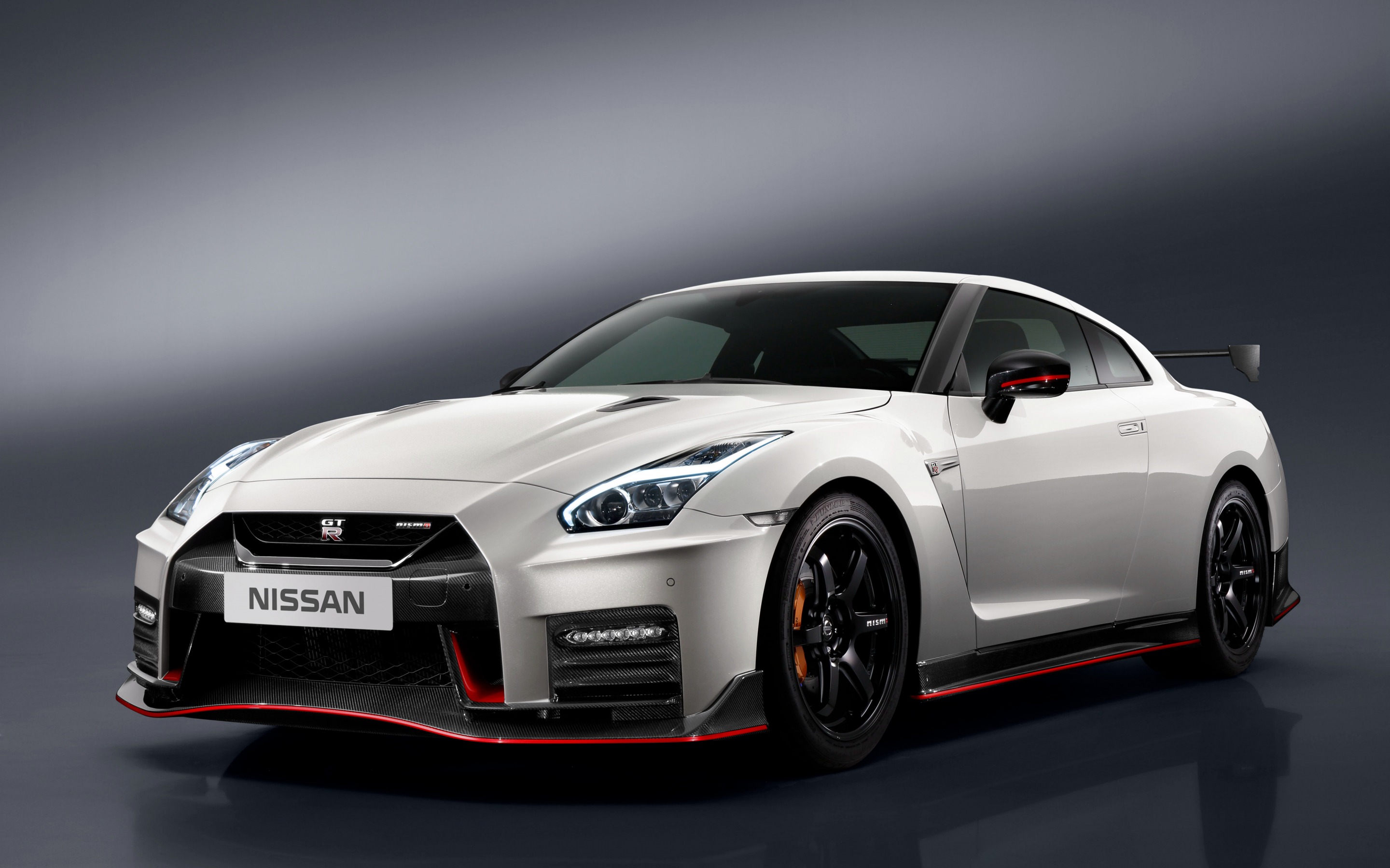 Description: A white nissan sports car on a dark background with a red stripe around the front of the car and the front of the car.