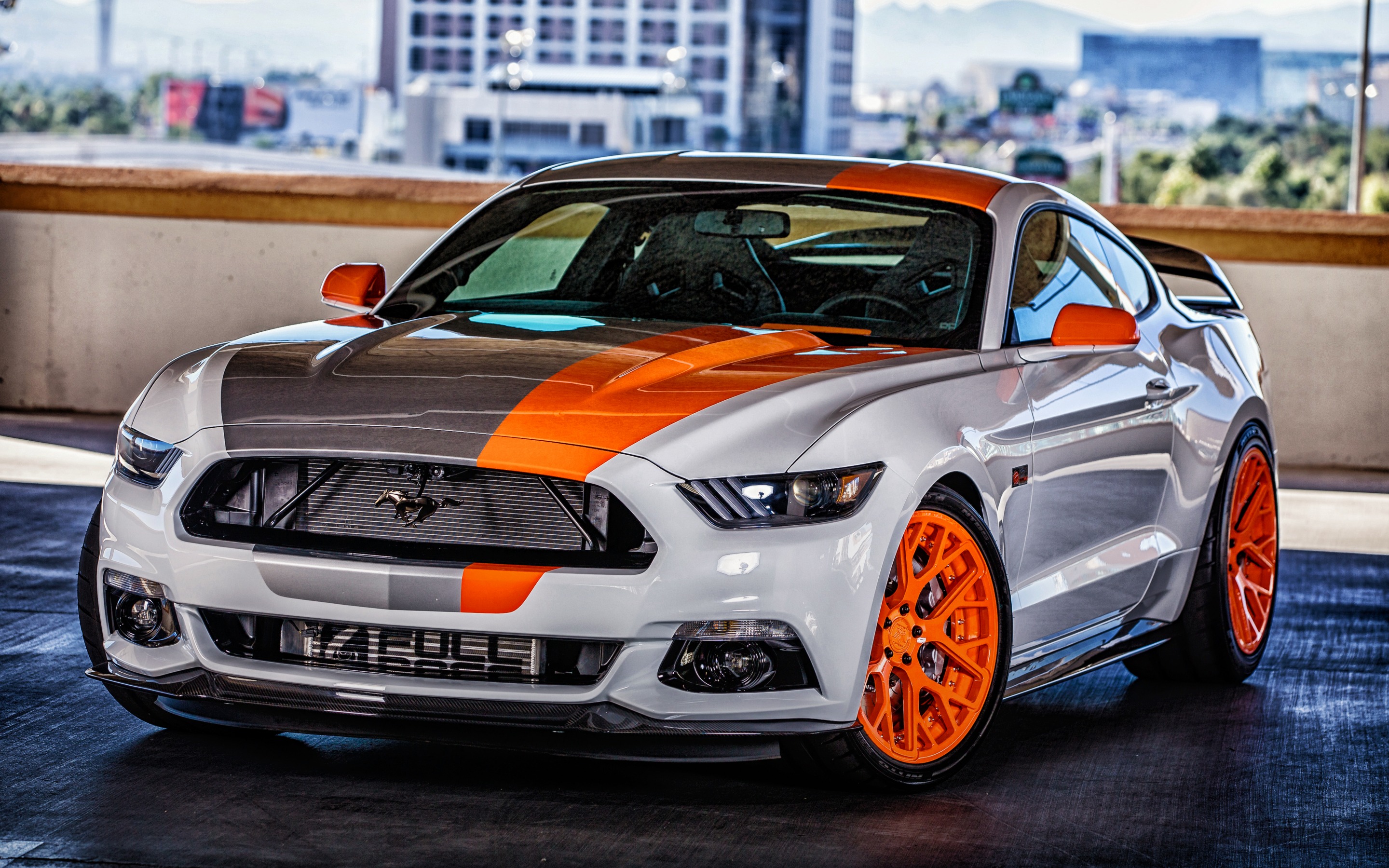 Description: A white and orange mustang with orange stripes on it's hood and hood hood.