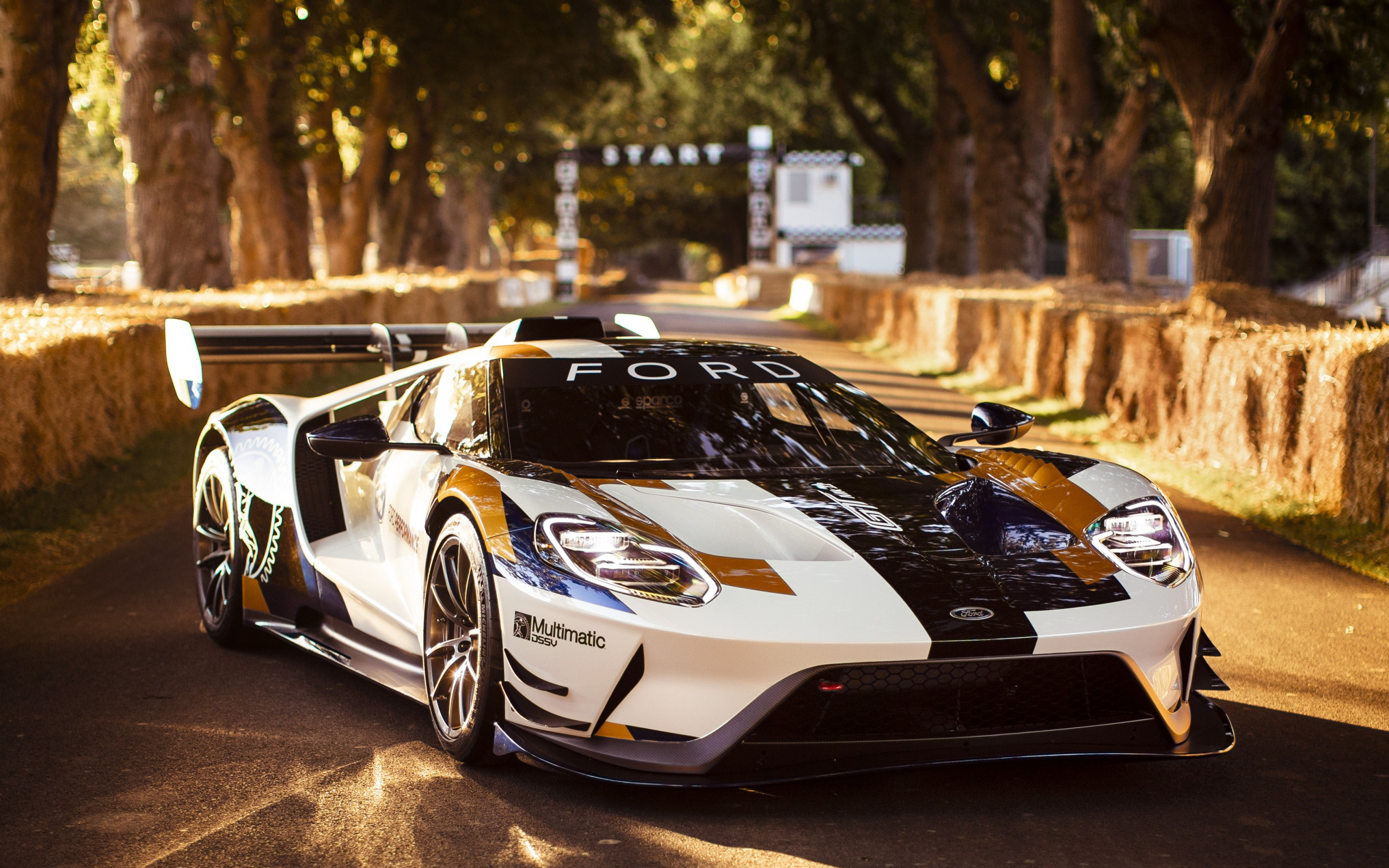 Description: A white and orange race car driving down a road next to hay bales and trees on either side of the road.