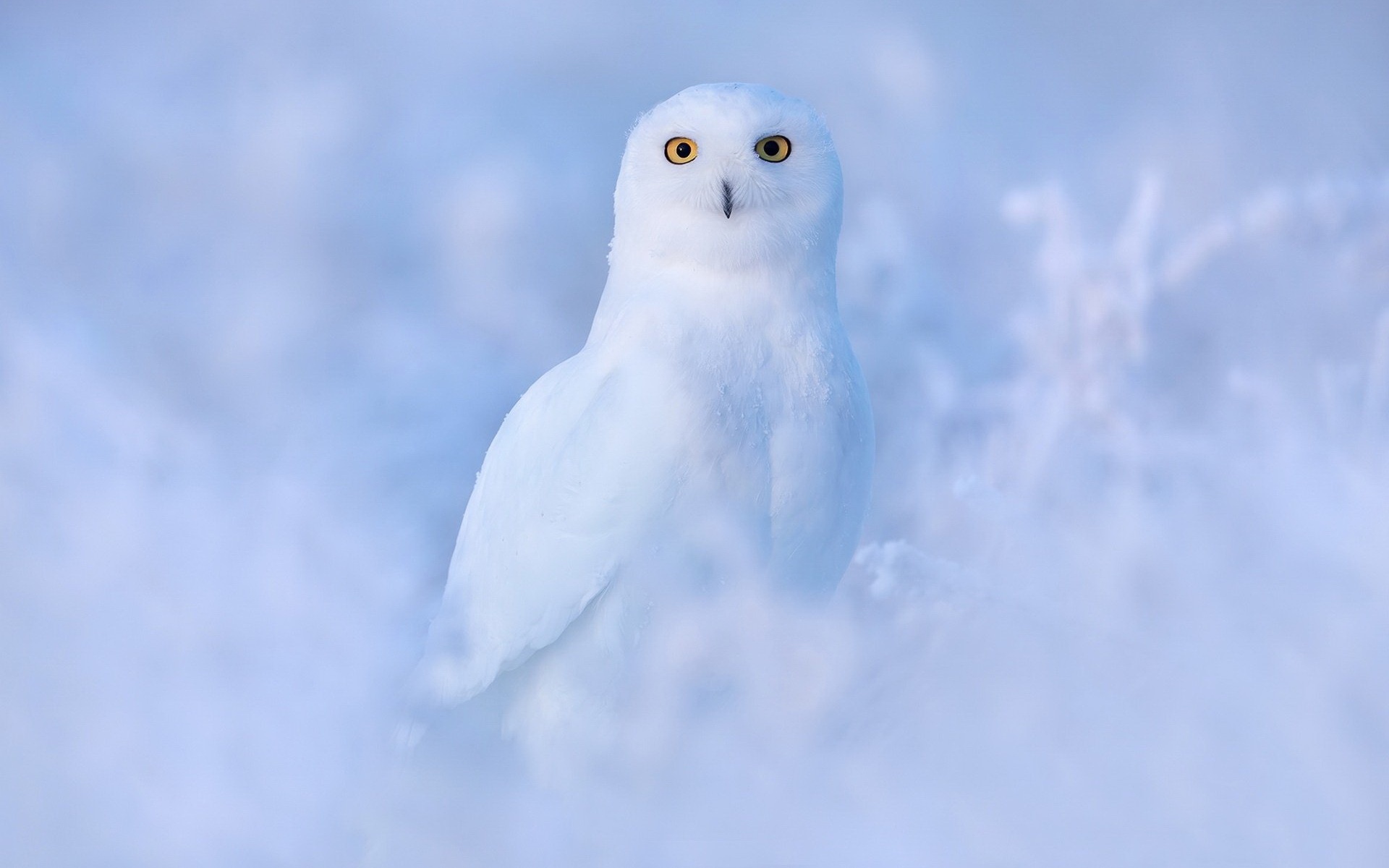 Description: A white owl is standing in the snow with yellow eyes and a black nose and yellow eyes is looking at the camera.