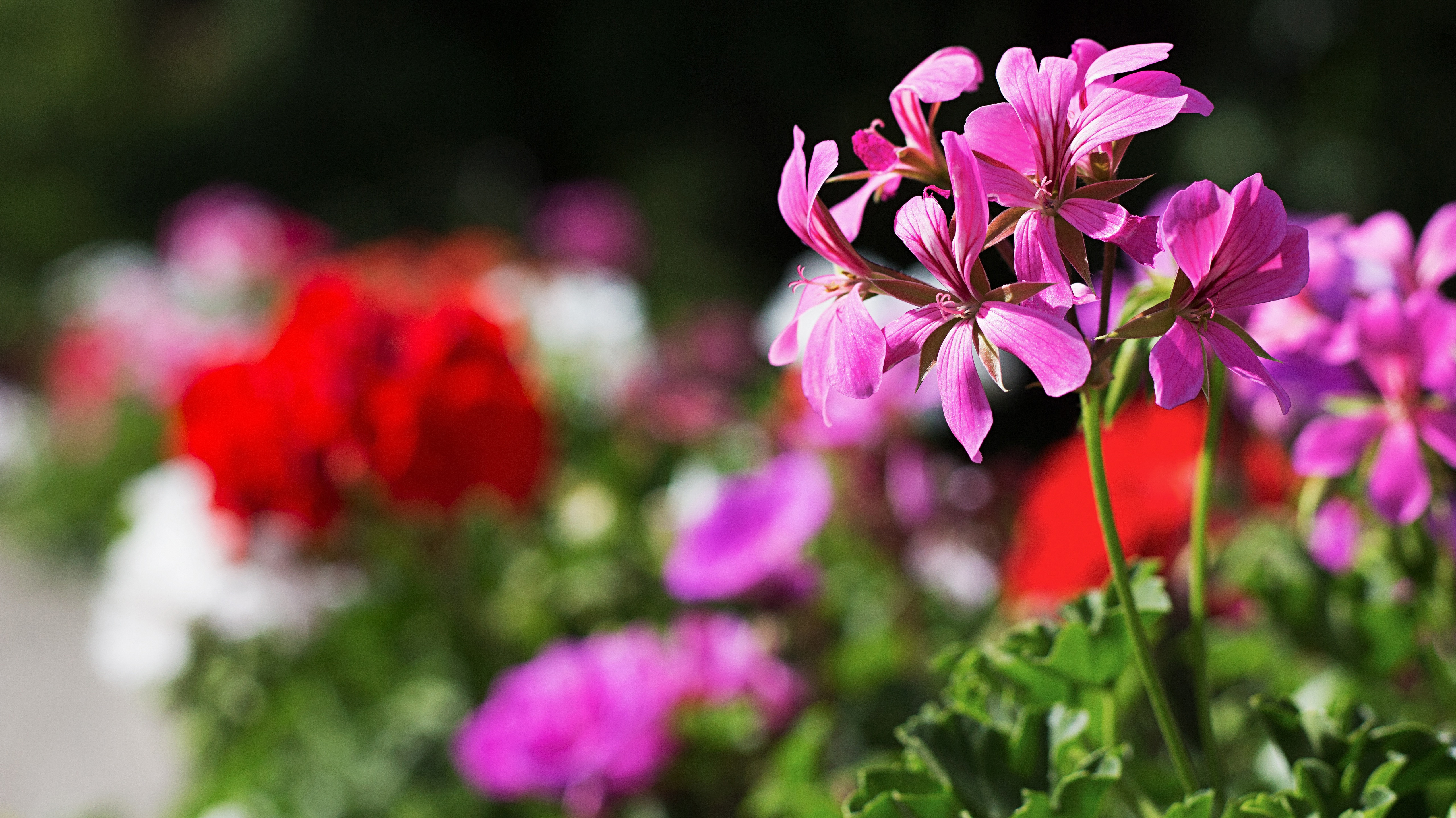 Description: A field of flowers with red and pink ones in the background and a white one in the foreground.