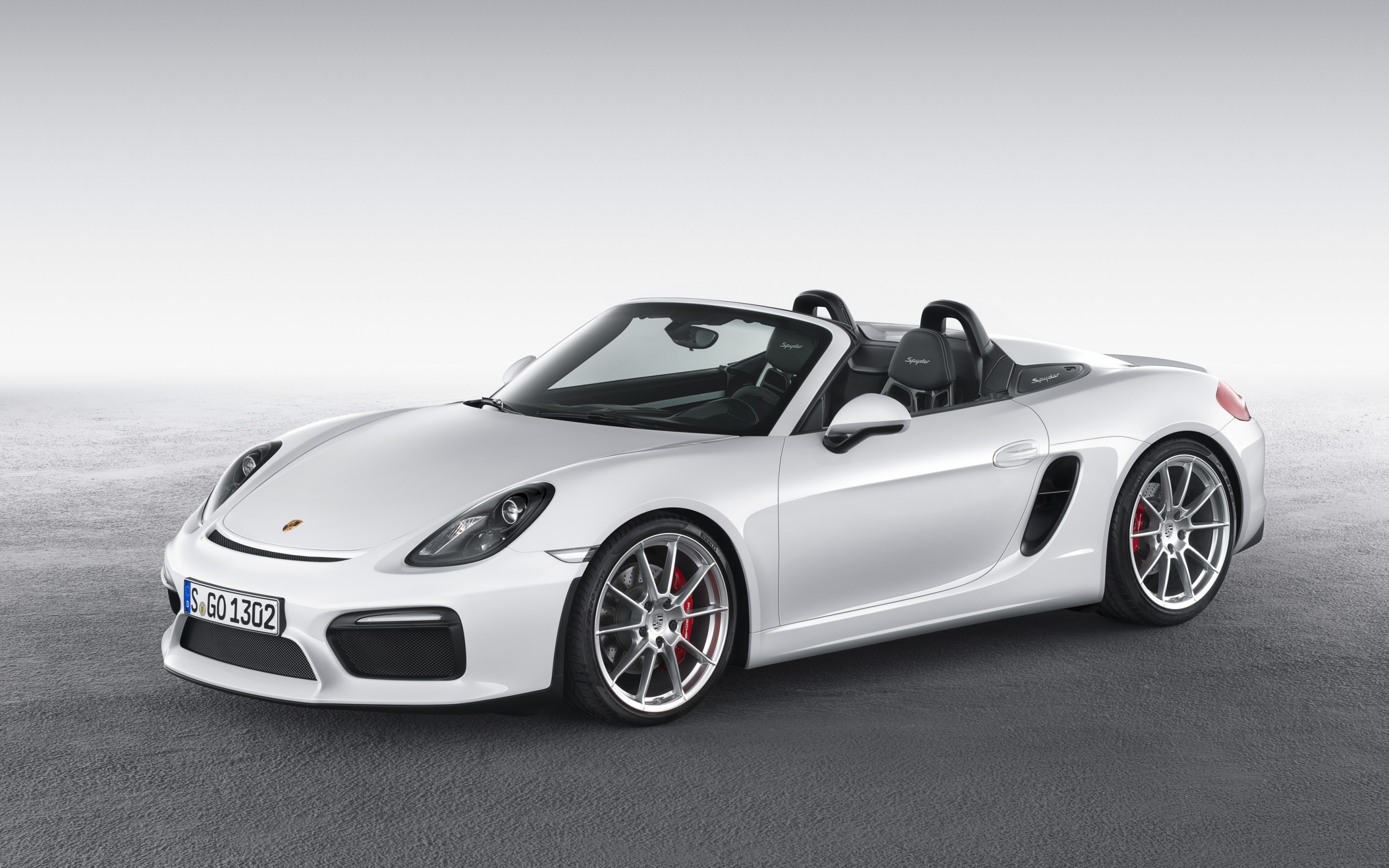Description: A white porsche sports car parked in a parking lot with a sky background and a black roof and the top down.