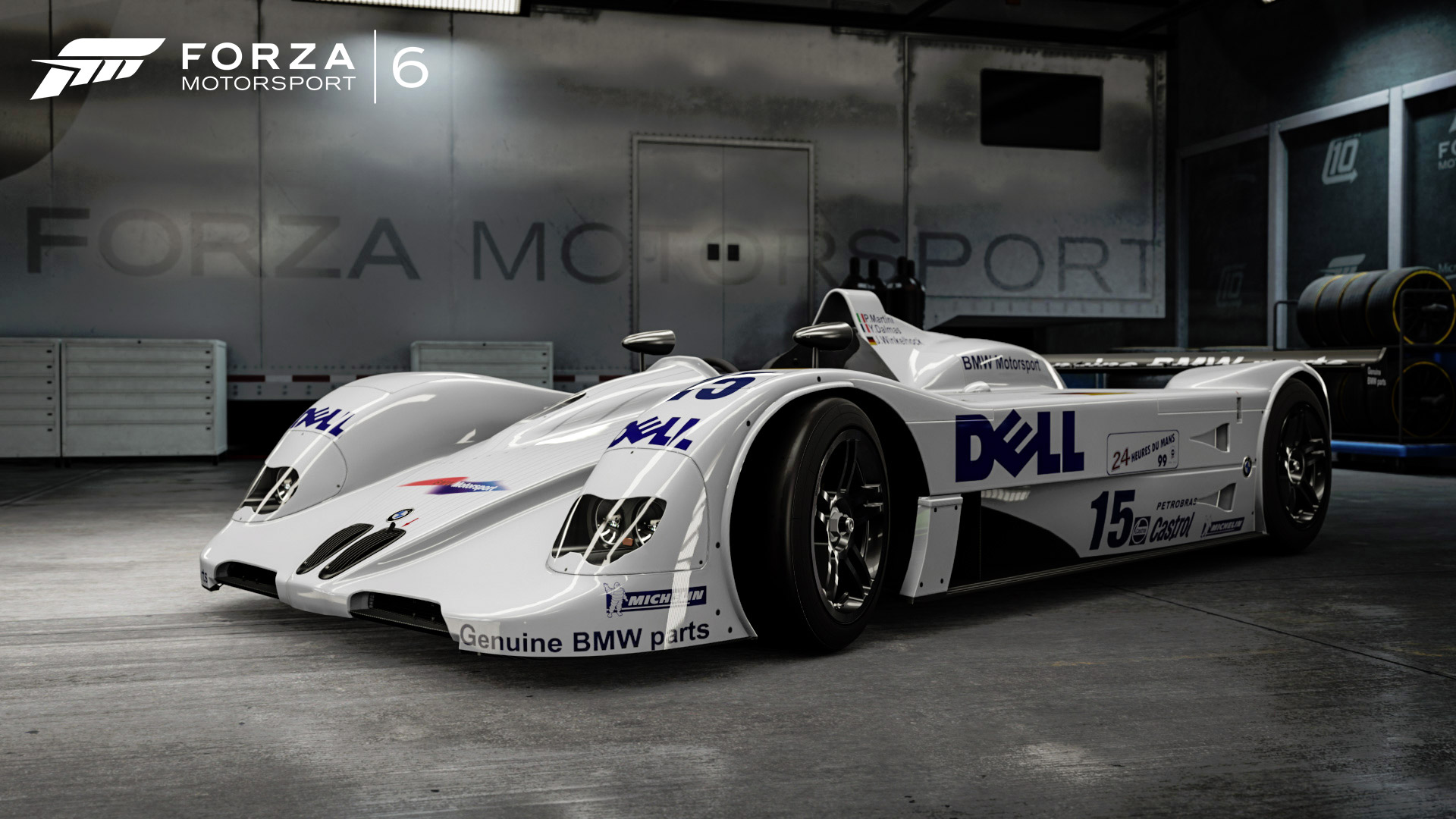 Description: A white race car parked in a garage with a wall behind it that says forza motorsports motorsports on it.