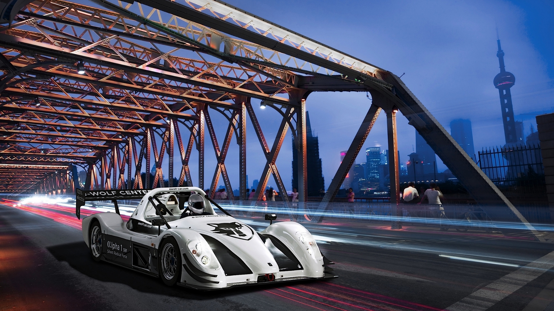 Description: A white race car driving down a street under a bridge at night with lights on the side of it.
