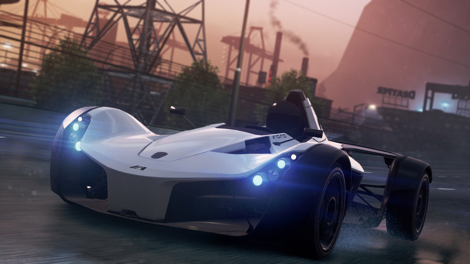 Description: A white race car driving down a street at night with lights on it's side and a power plant in the background.