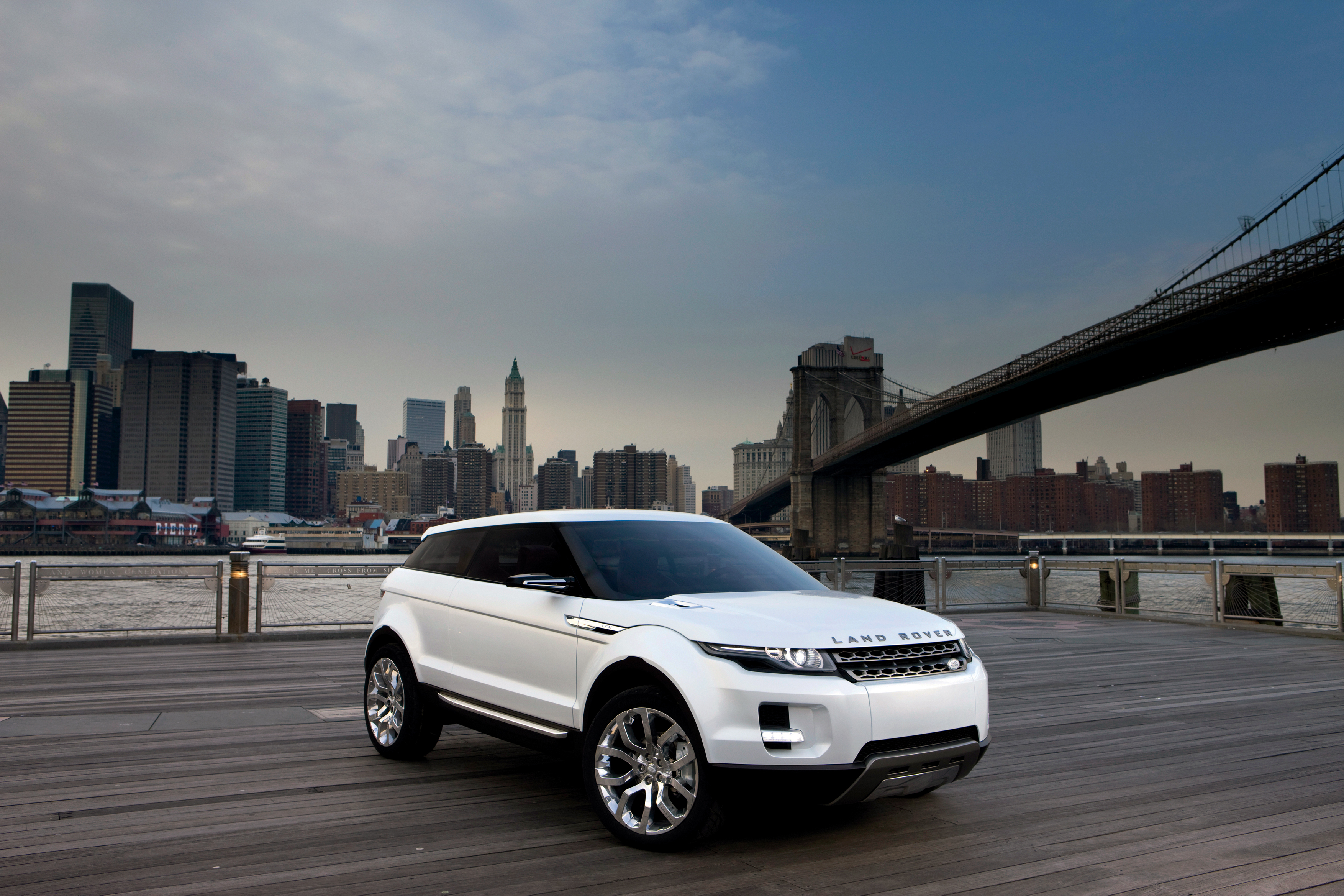 Description: A white range rover parked on a wooden deck in front of a city skyline with a bridge in the background.