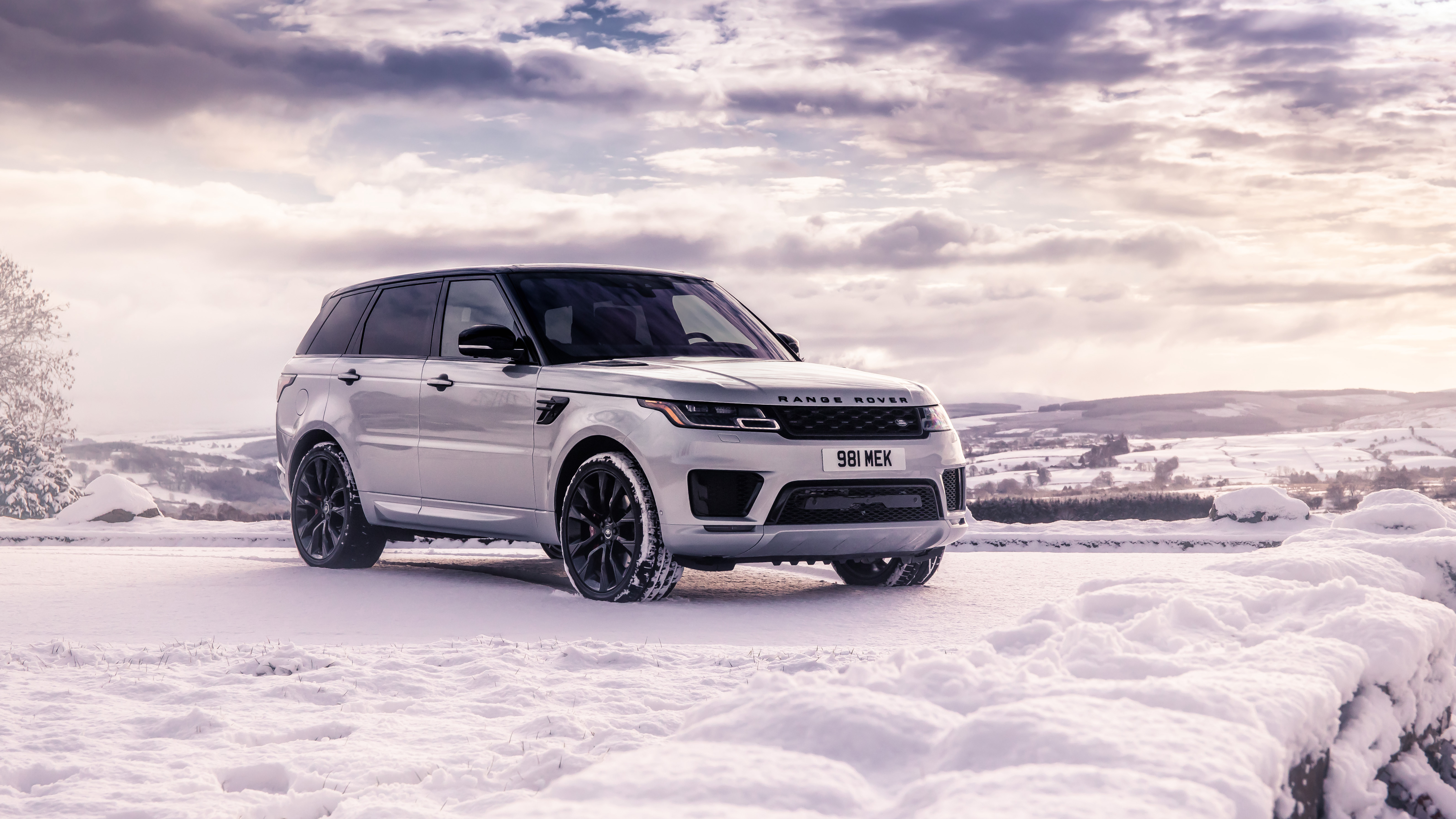 Description: A white range rover parked in the snow on a road with a cloudy sky in the background and a few clouds in the sky.