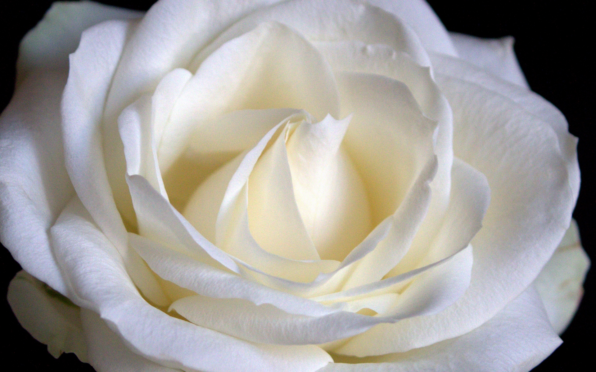 Description: A white rose is shown in close up view of the petals and petals of it's petals.