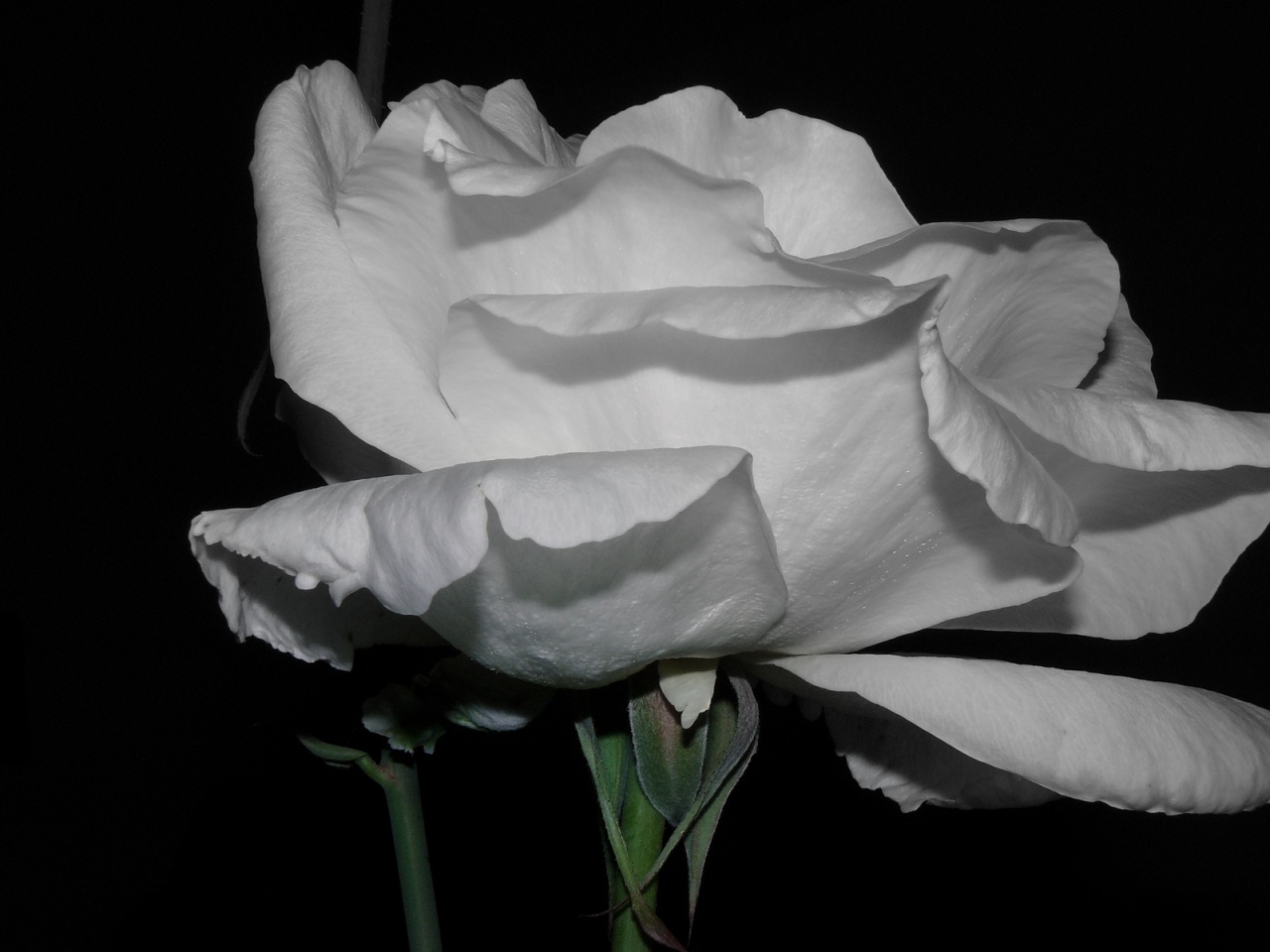 Description: A white rose is shown in the dark with its petals still open and the petals still open.