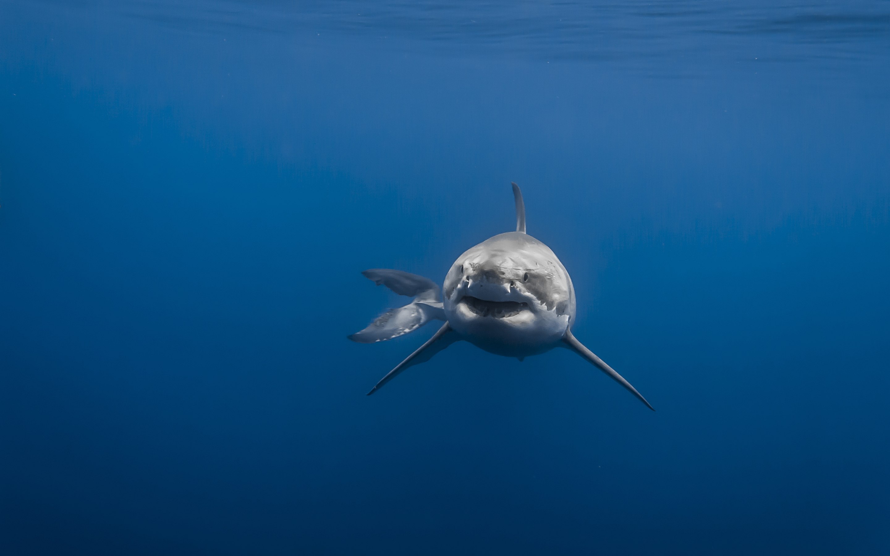 Description: A large white shark swimming in the ocean with its mouth open and it's teeth out of the water.