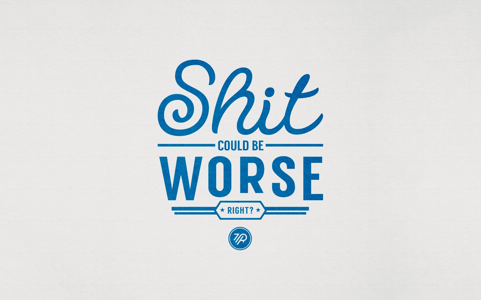 Description: A white shirt with blue lettering that says shit could be worse right now? on it's chest.
