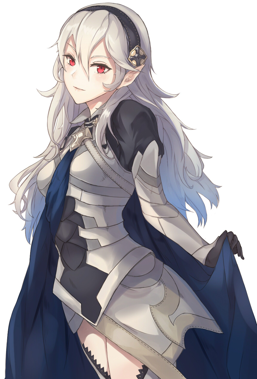 Description: A woman in a white and black outfit with long white hair and a blue cape on her head and a black and white outfit on her chest.