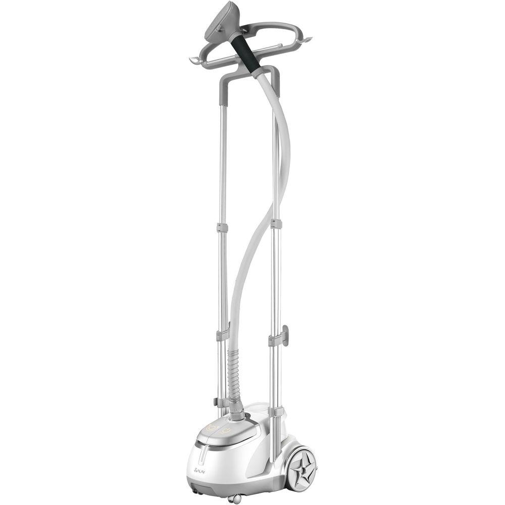 Description: A white and silver steam iron on a white background with a white background and a white background with a white background.