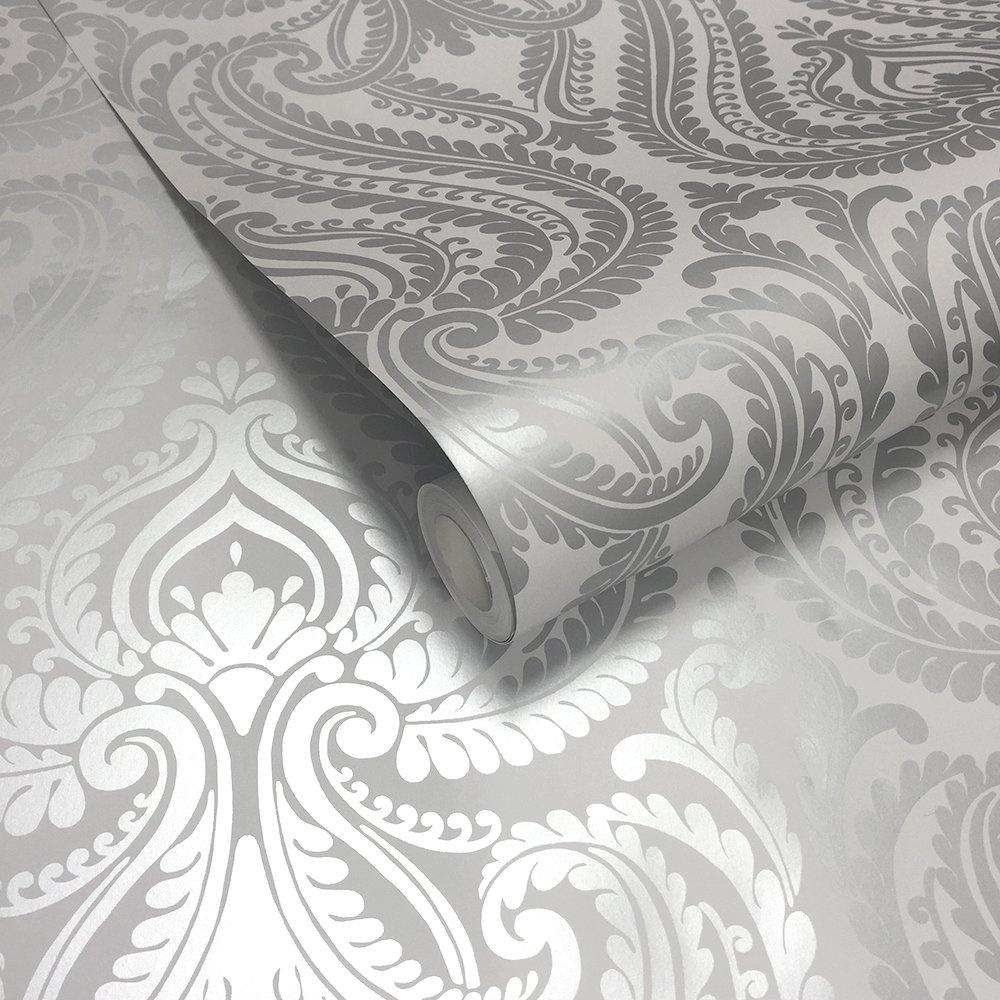 Description: A white and silver wallpaper with a pattern on it's surface and a roll of tape on the wall.