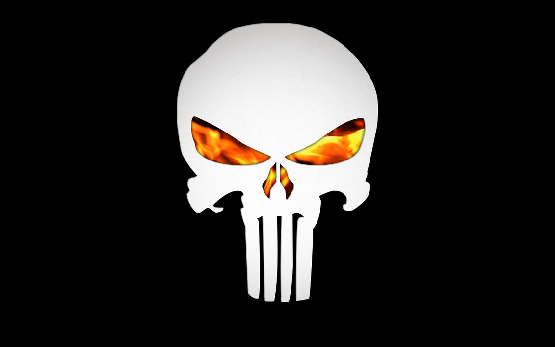 Description: A white skull with orange eyes on a black background with a black background and a black background with a white skull with orange eyes.