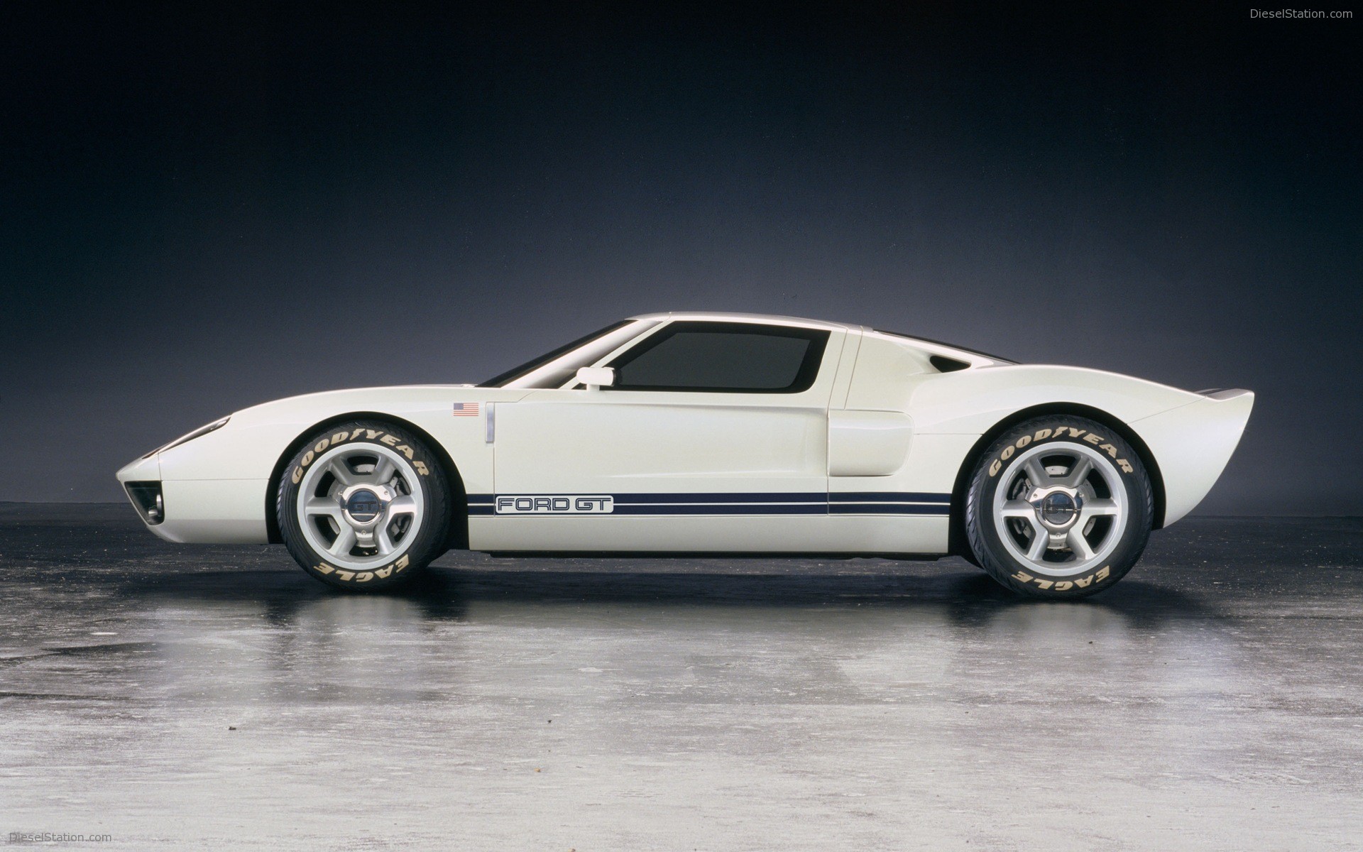 Description: A white sports car with a black stripe on the side of it's body and wheels.
