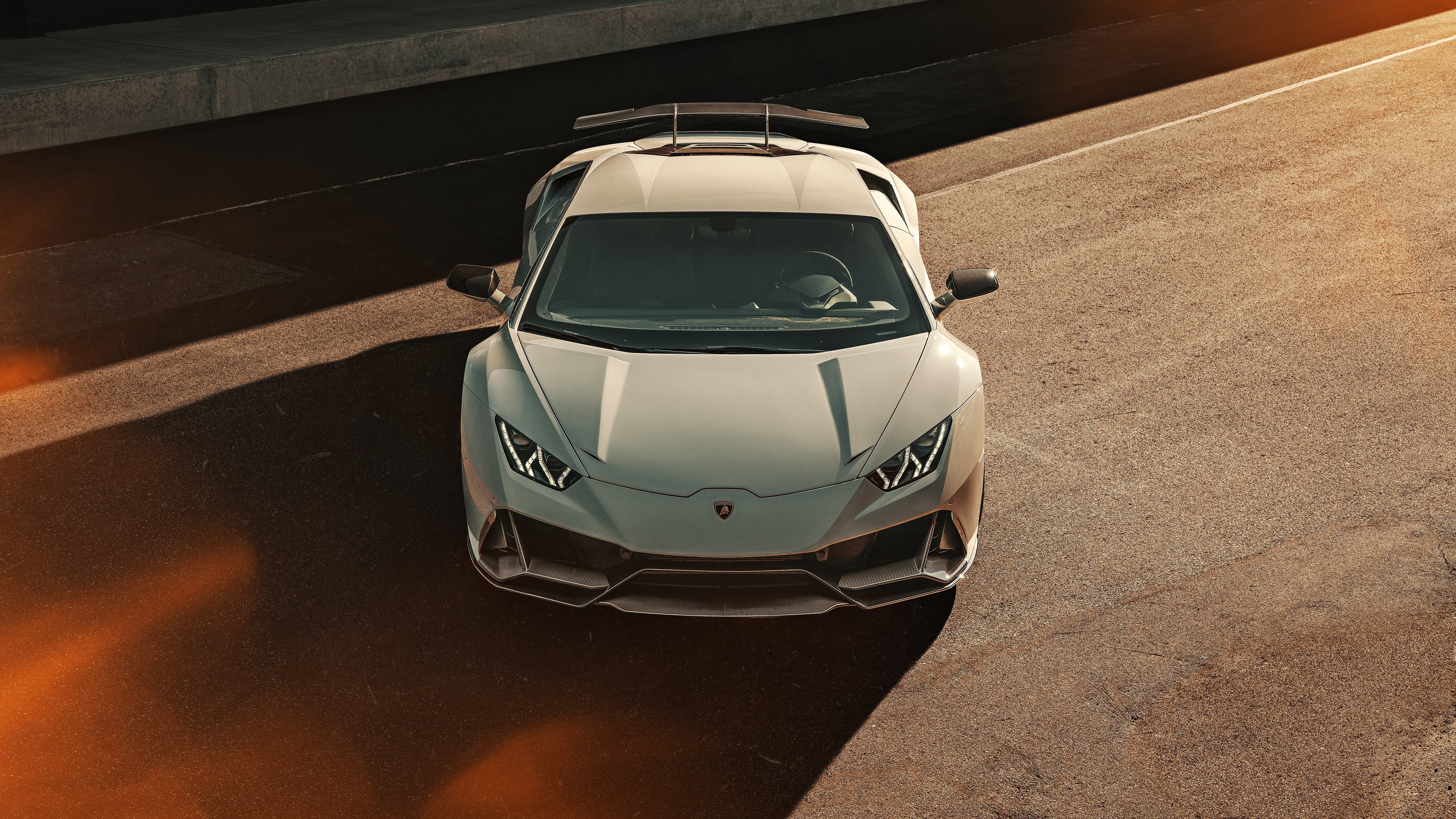 Description: A white sports car driving down a road next to a bridge and a building with a clock on top.