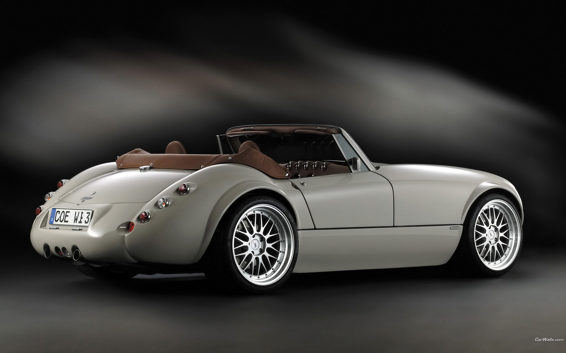 Description: A white sports car with a brown top and a brown seat on a black background with a white background.