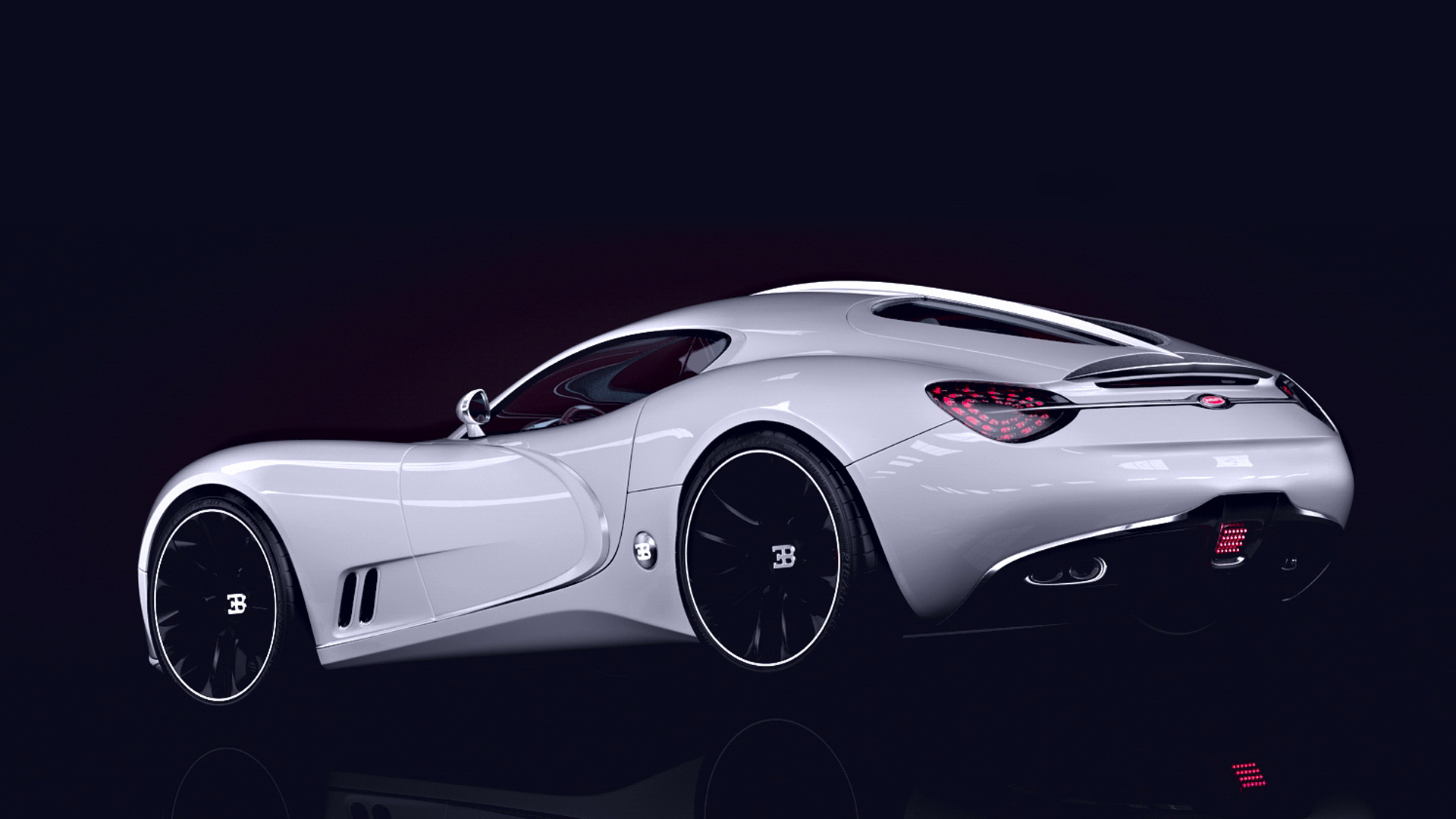 Description: A white sports car is shown in a dark room with a black background and a red light on the side.