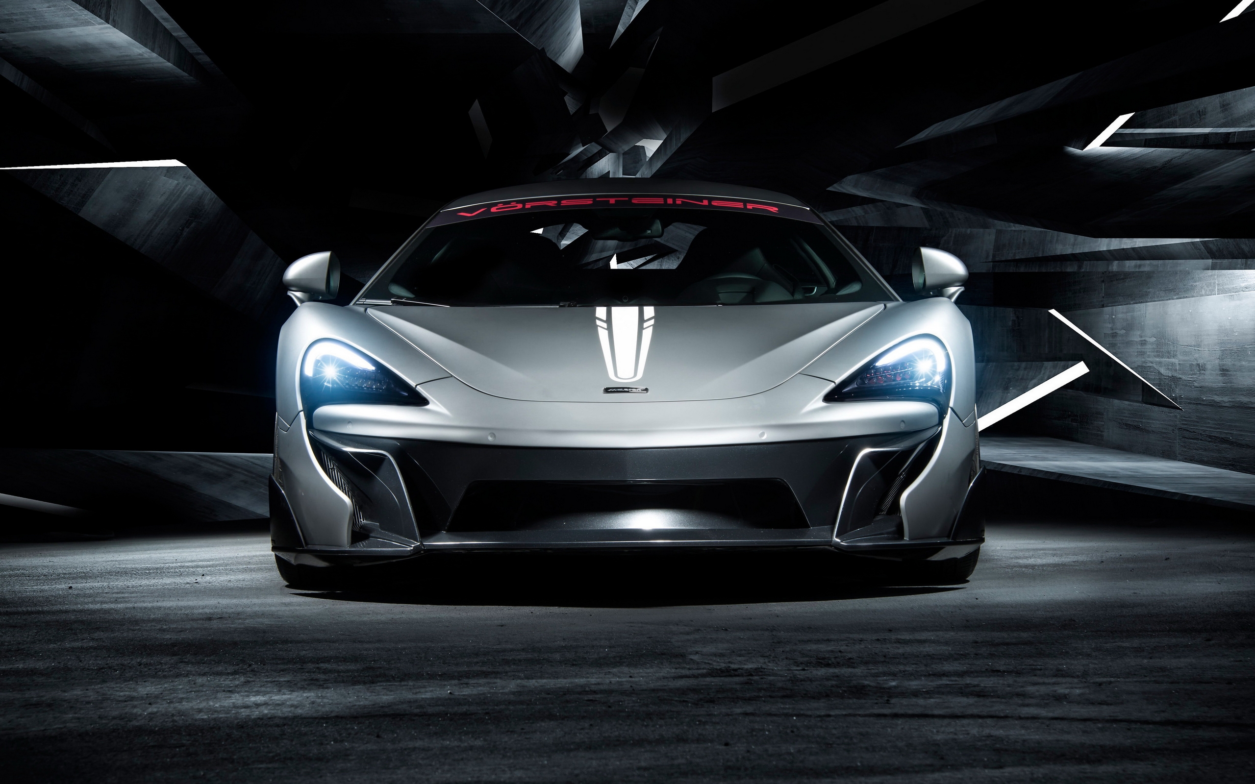 Description: A white sports car in a dark tunnel with lights on it's hood and hood lights on the front.