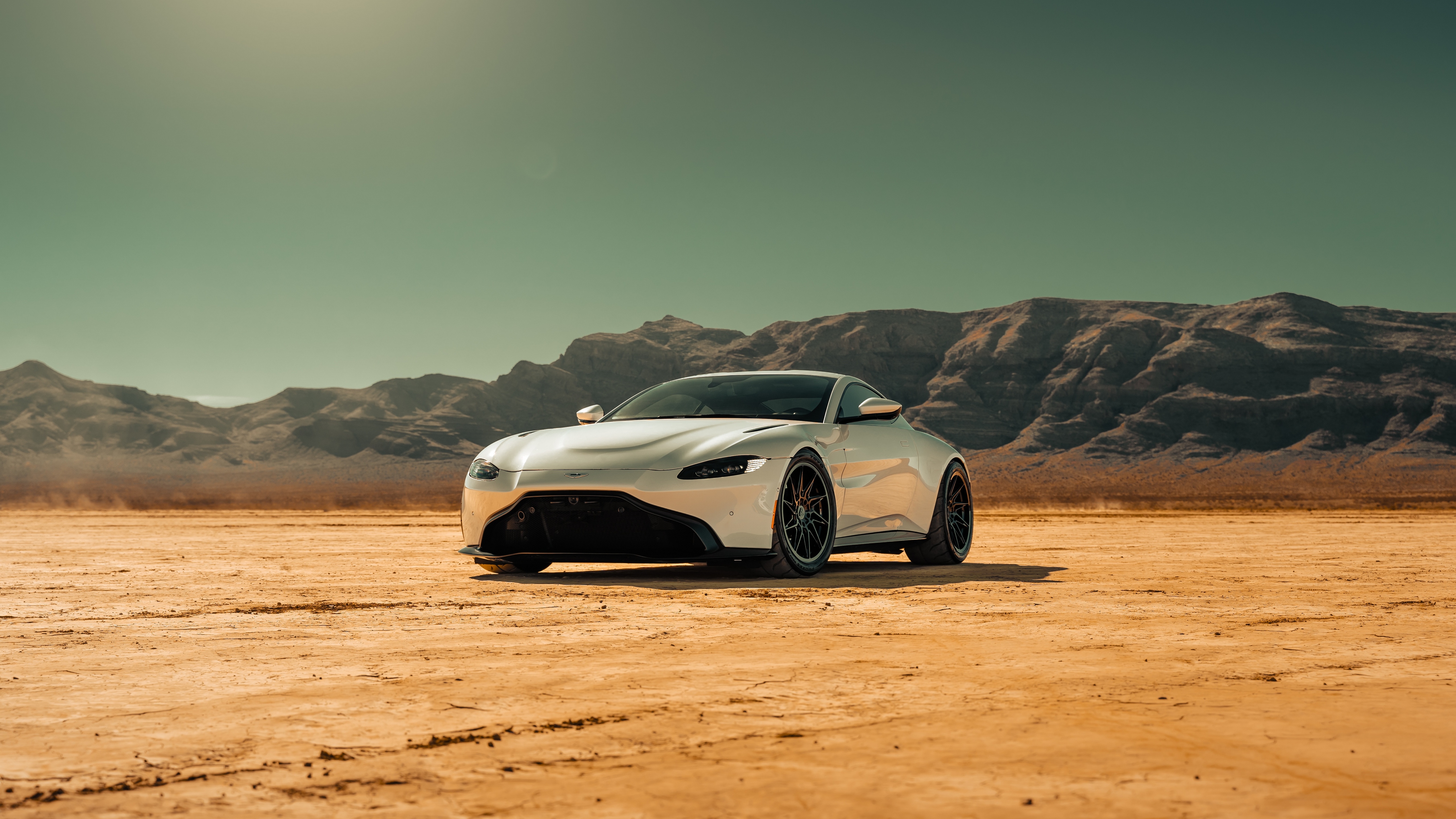 Description: A white sports car in a desert area with mountains in the background and a sun shining on the horizon.