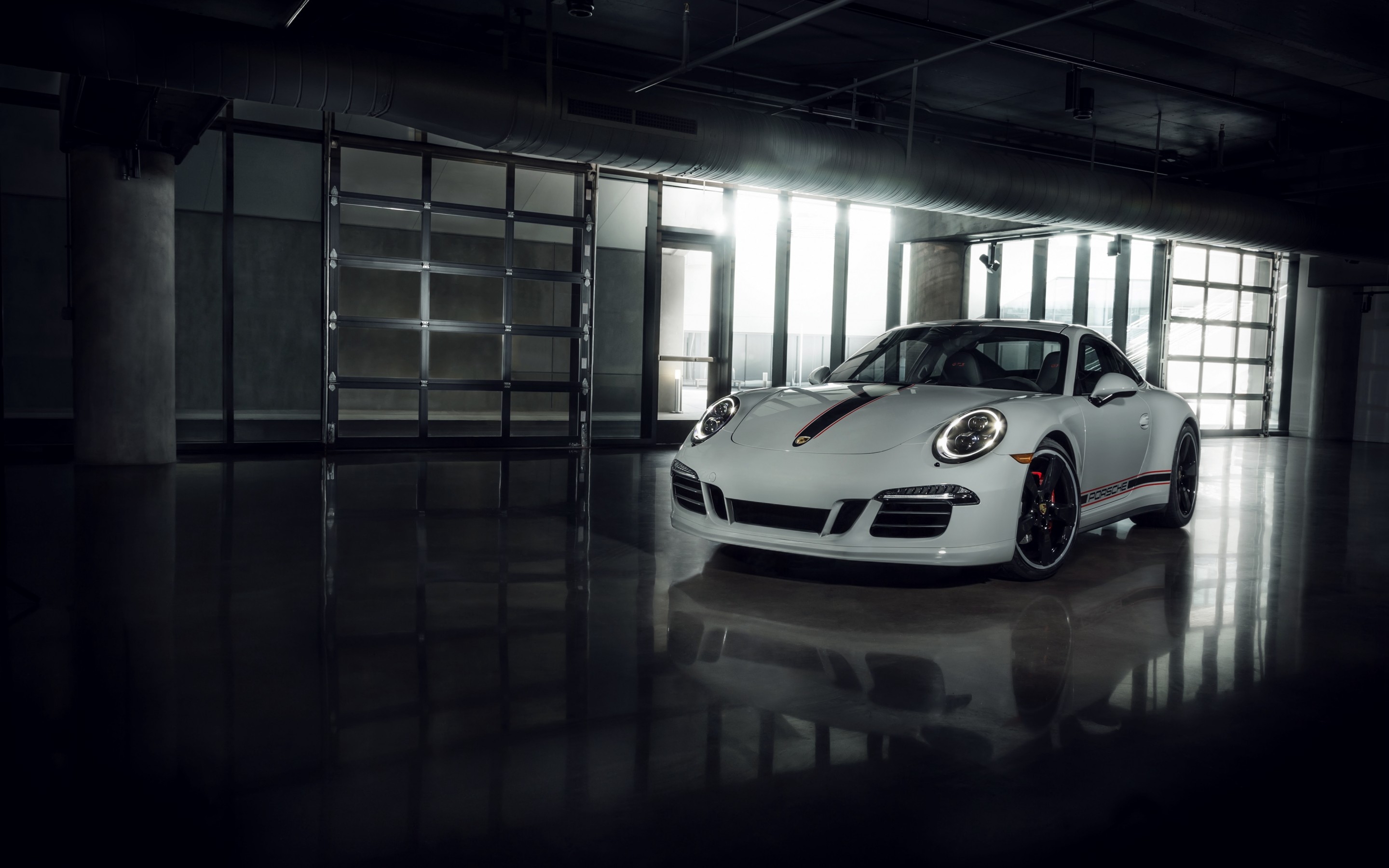 Description: A white sports car parked in a garage with a light shining on it's side window and door.