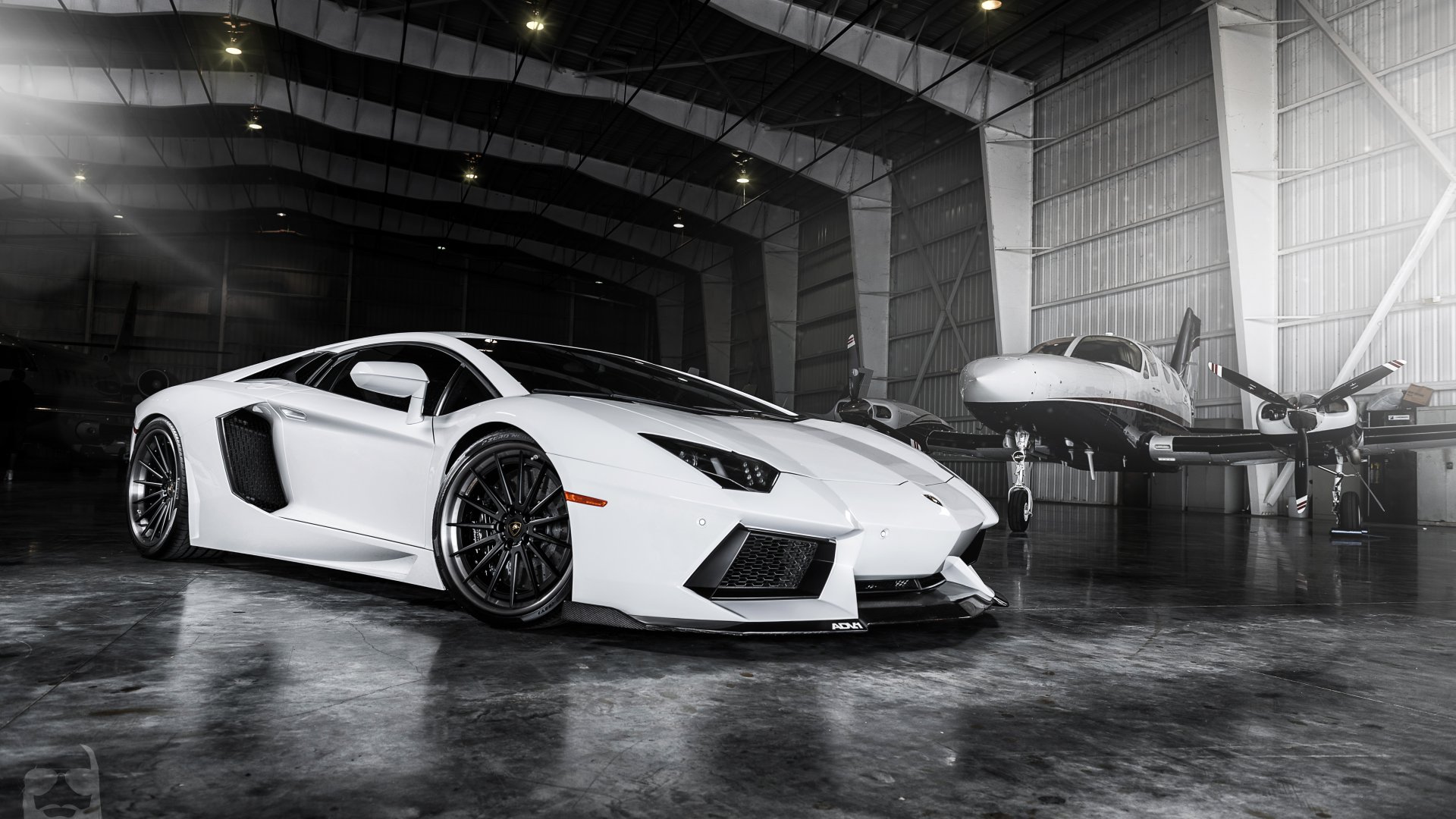 Description: A white sports car parked in a hangar next to a plane and a jetliner on the ground in front of it.