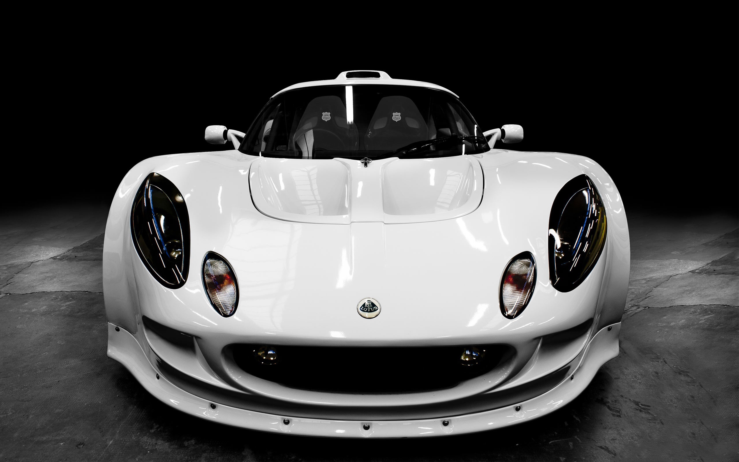 Description: A white sports car parked in a garage with its hood up and lights on and the hood down on.
