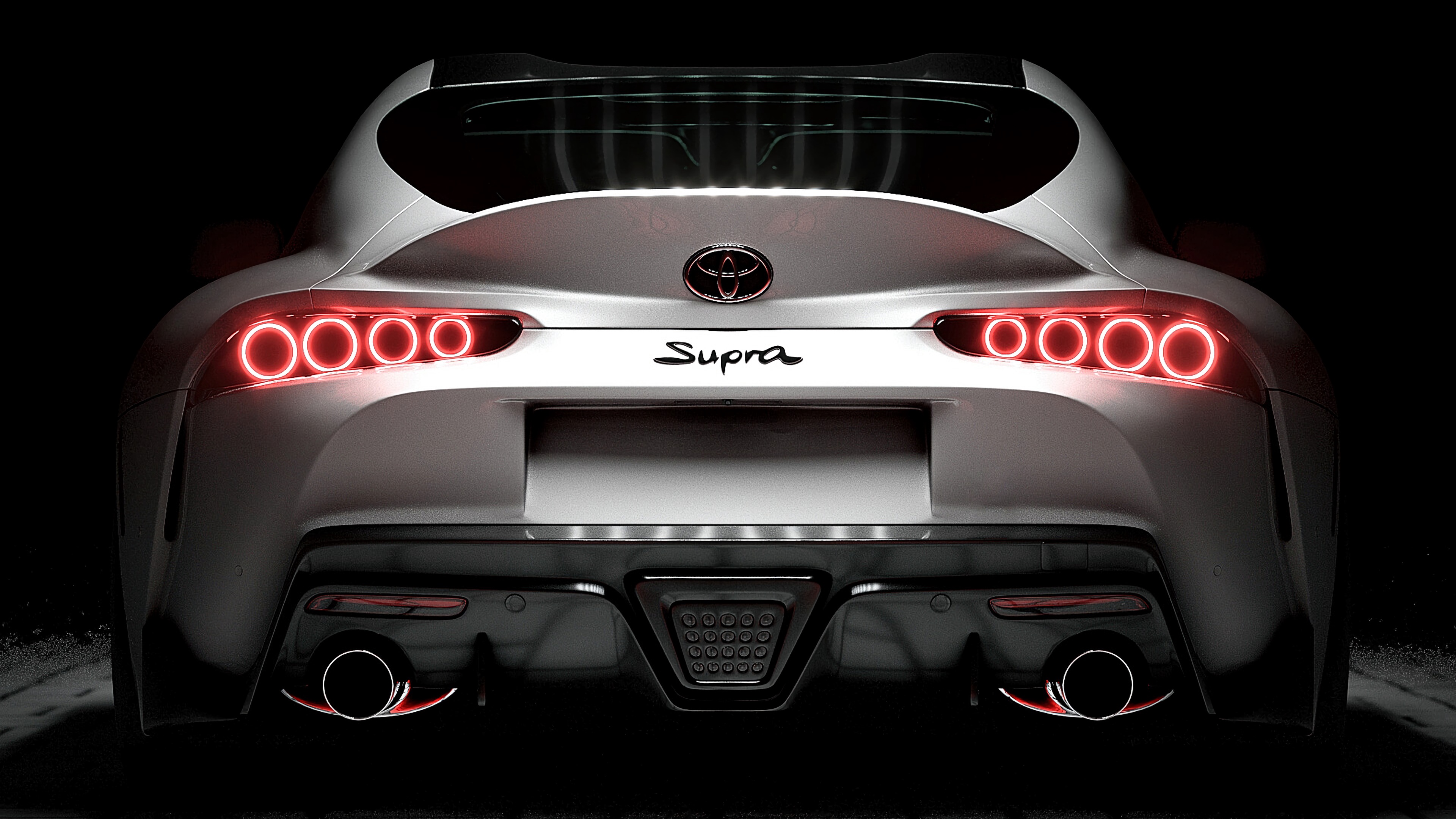 Description: A white sports car with its lights on in the dark room with a black background and a black floor.