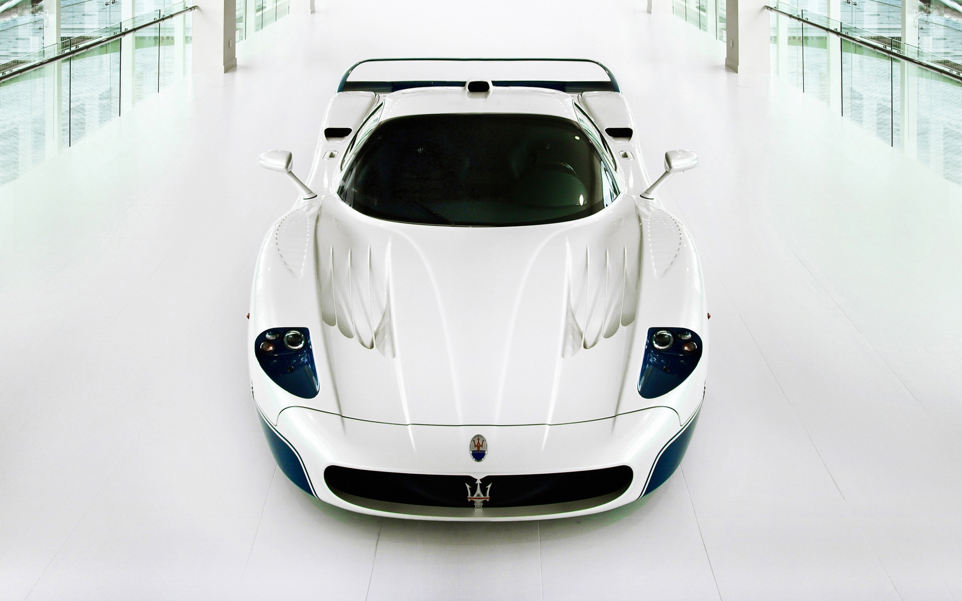 Description: A white sports car parked in a white room with a white floor and a long line of windows behind it.
