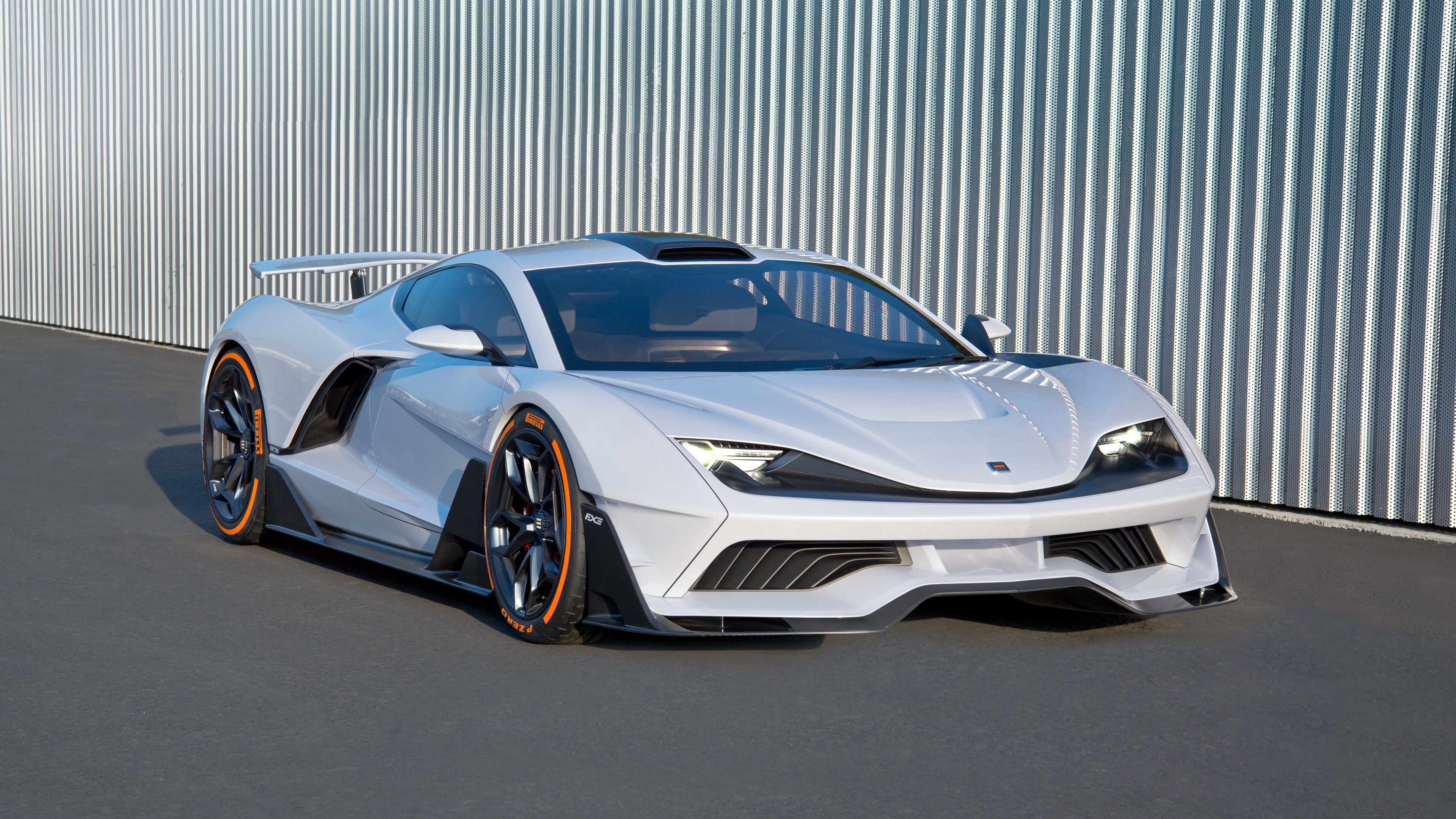 Description: A white sports car parked in front of a building with a metal wall behind it and a door on the side of the building.
