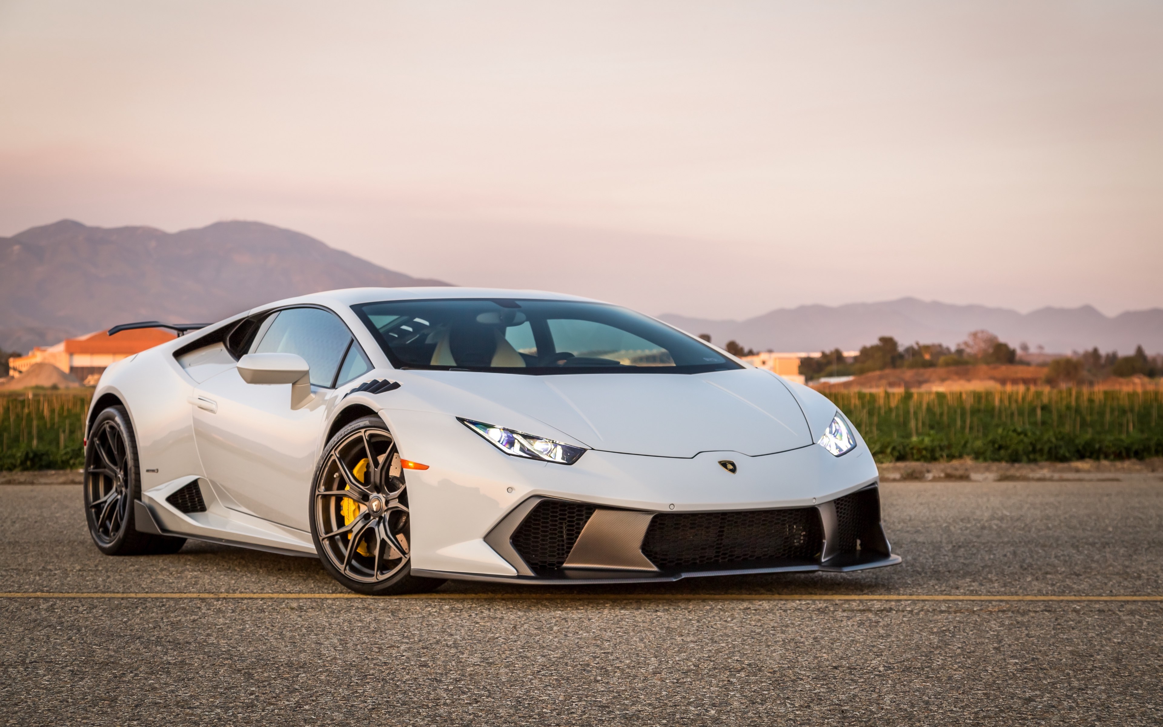 Description: A white sports car parked on the side of the road in front of a mountain range at sunset or dawn.
