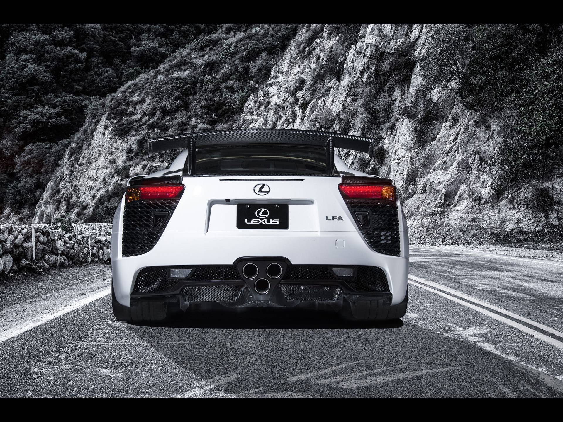 Description: A white sports car driving down a road next to a mountain side wall of rocks and a fenced in area.