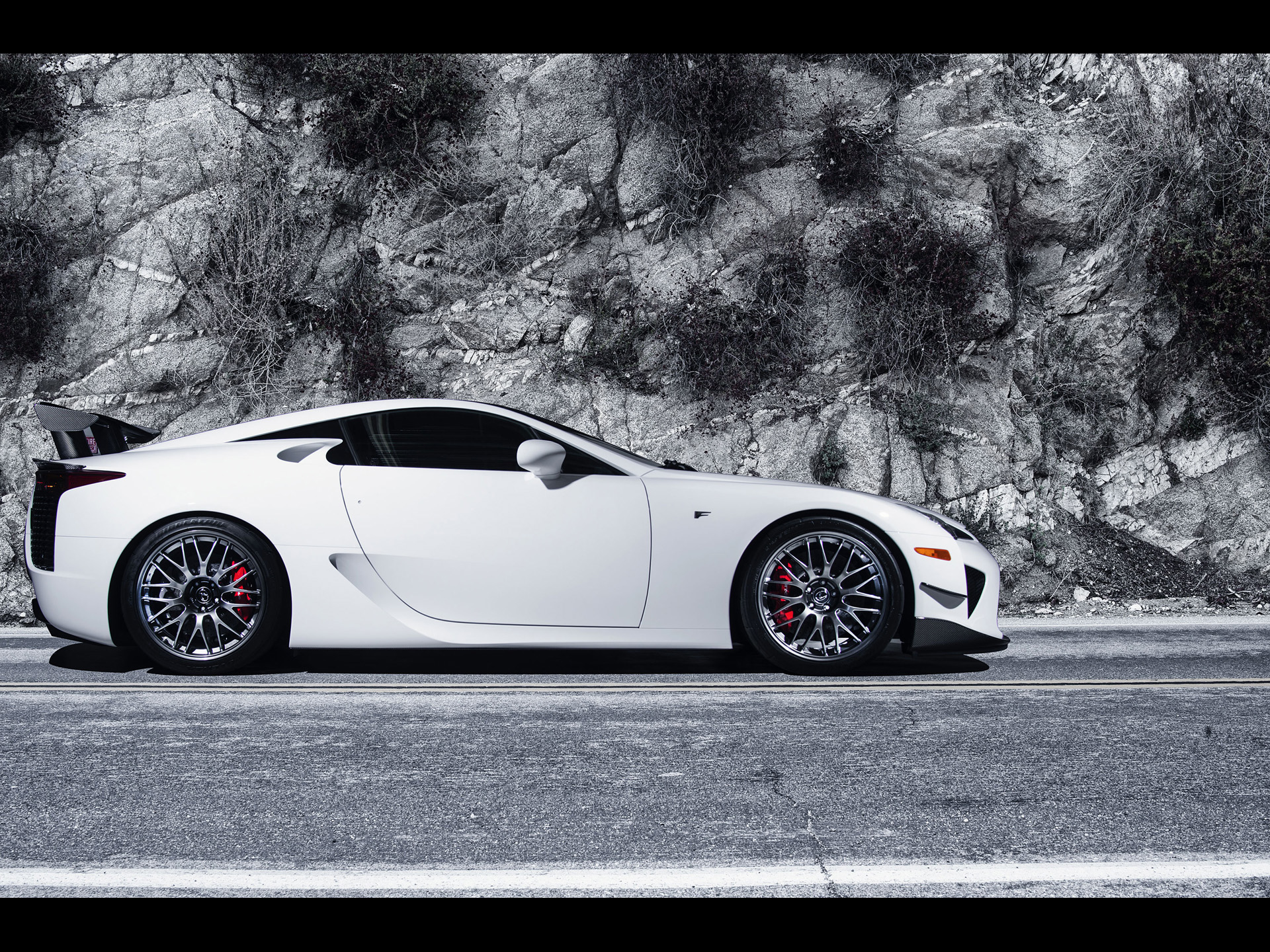Description: A white sports car parked on the side of the road near a mountain side wall of rock formations and grass.