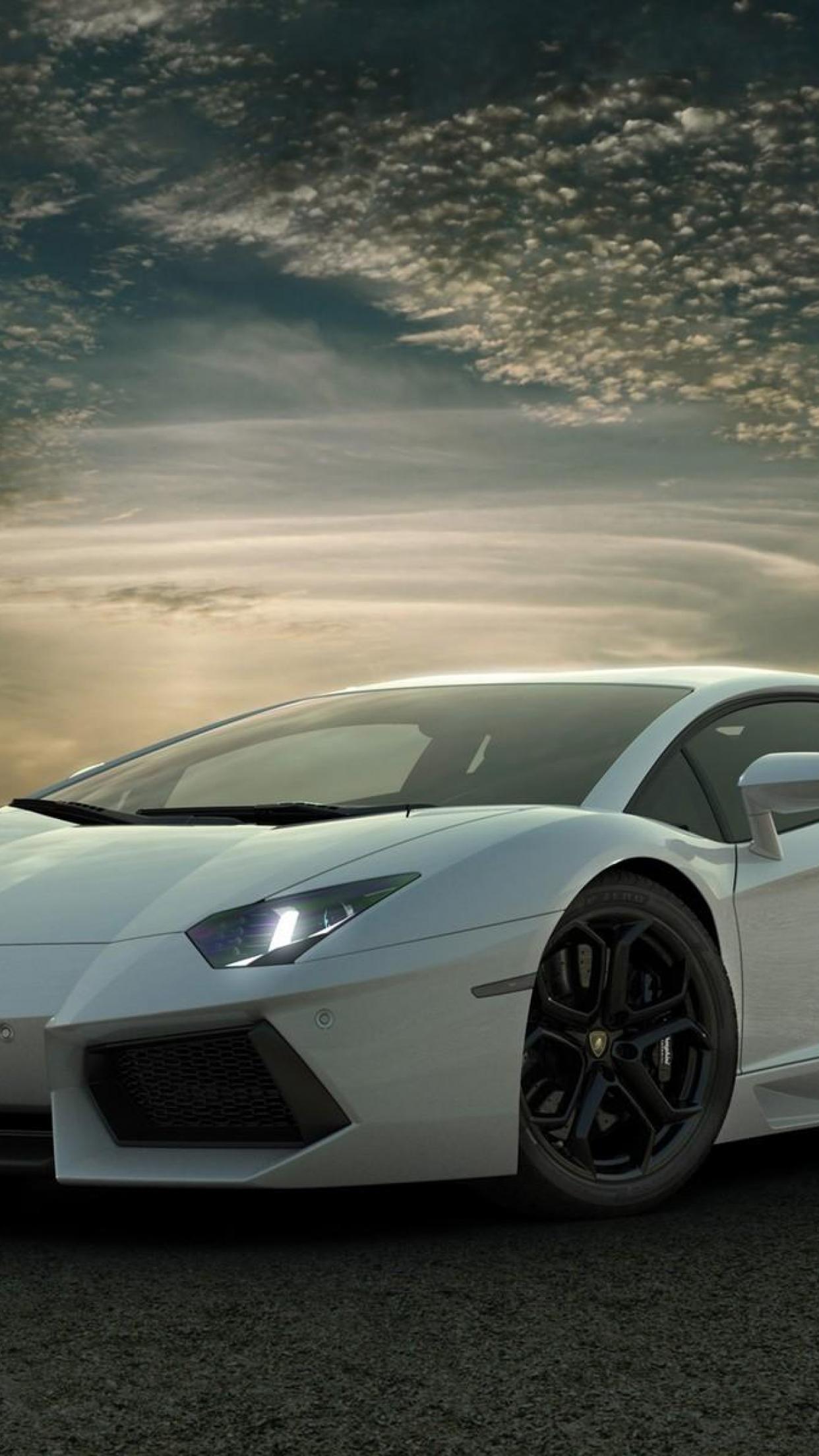 Description: A white sports car parked on a road under a cloudy sky with clouds in the background at dusk time.