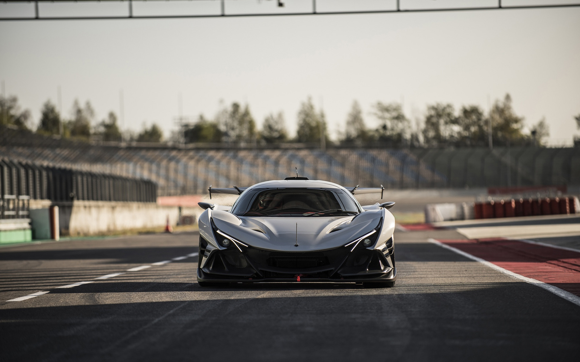 Description: A white sports car driving down a race track with trees in the background and a sky background behind it.