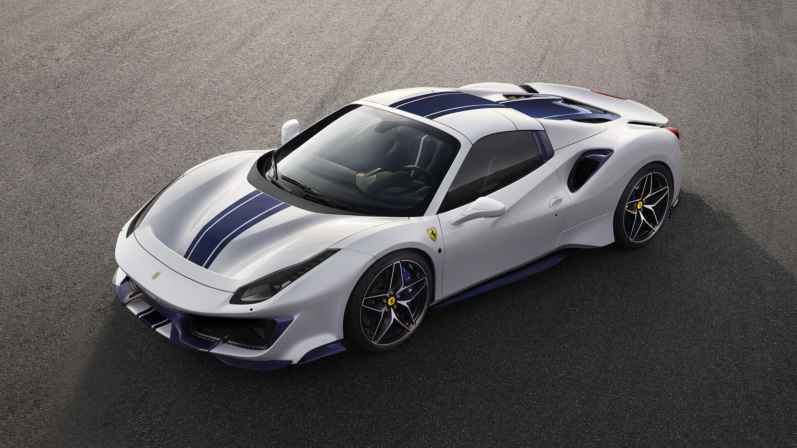 Description: A white sports car driving on a race track with blue stripes on the side of it's hood.