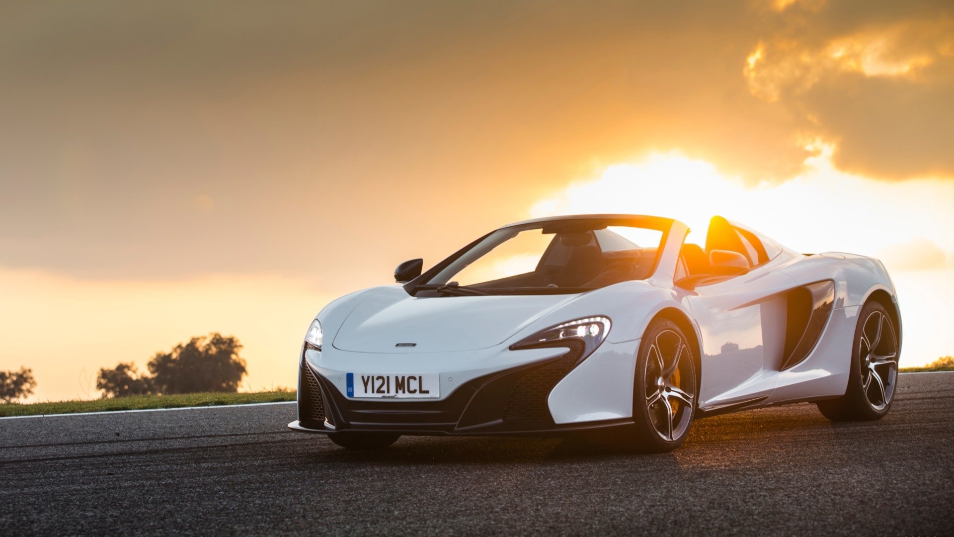 Description: A white sports car driving down a road at sunset or dawn with the sun behind it and the clouds.