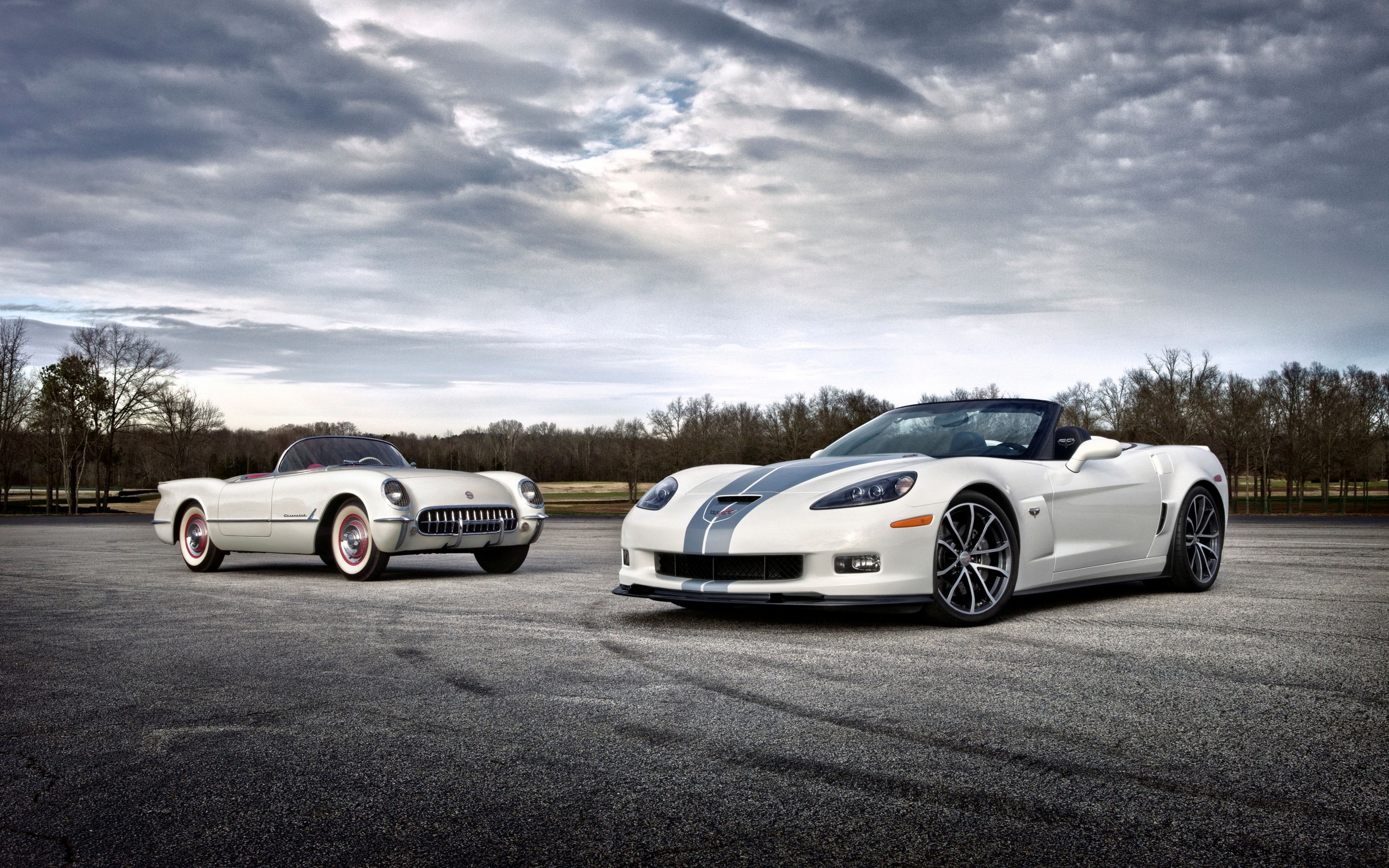 Description: Two white sports cars parked in a parking lot under a cloudy sky with trees in the background and a few clouds in the sky.