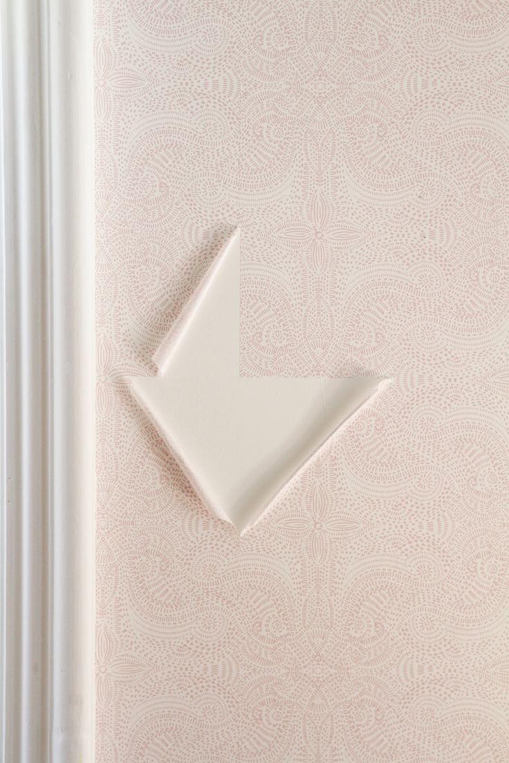 Description: A white square object on a pink wallpapered background with a white arrow pointing up at it's center.
