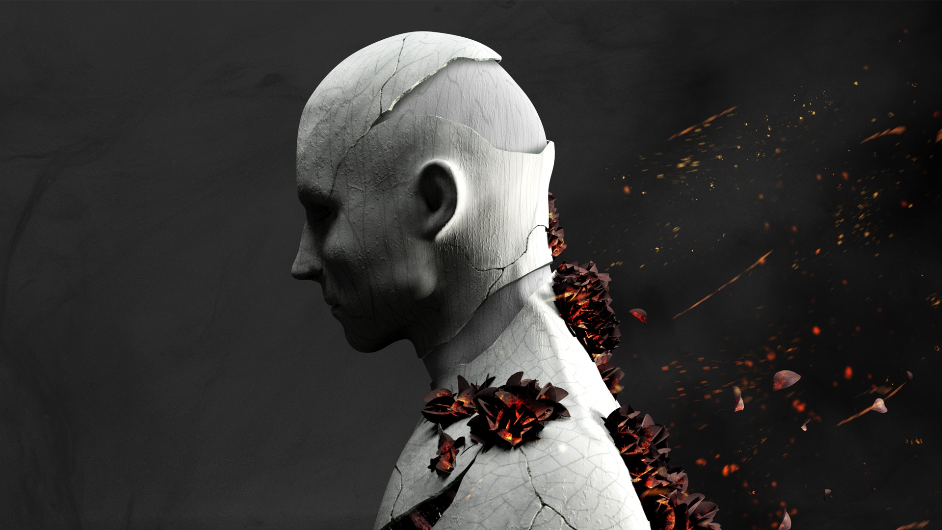 Description: A white statue with a flower around its neck and a black background with a red flower around its neck.