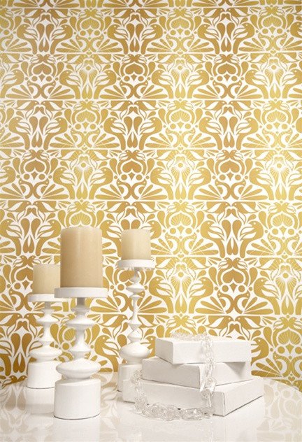 Description: A white table topped with two white candles and a white box filled with books next to a wallpaper.